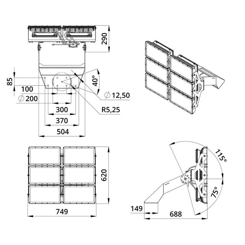 У прожектора может быть несколько модулей: от 3 до 6 штук в зависимости от мощности. Угол наклона каждого модуля можно регулировать отдельно. Корпус покрыт порошковой краской (по запросу возможна окраска в любой цвет по каталогу RAL).