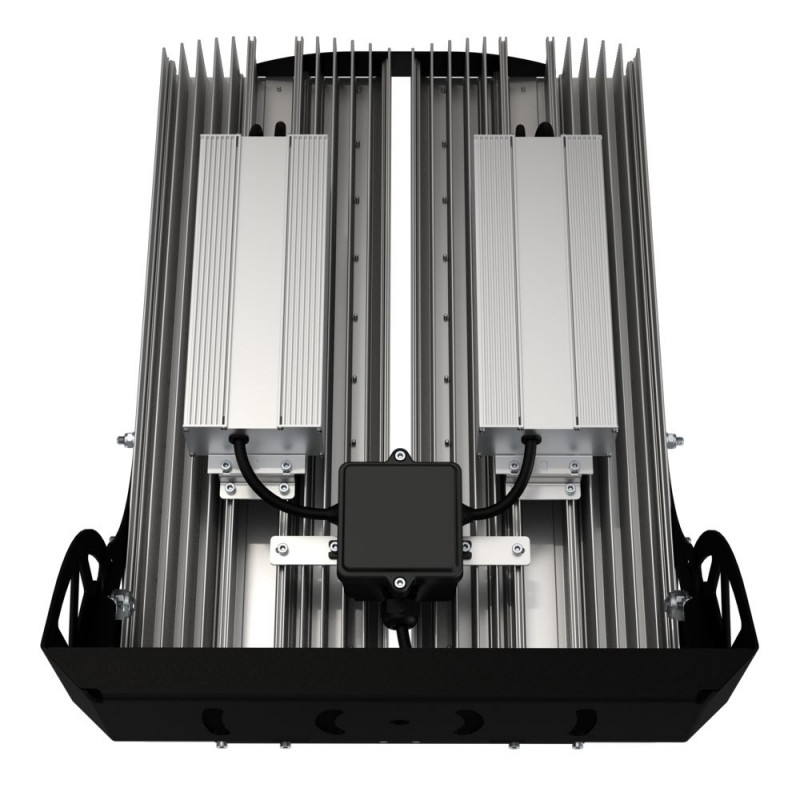 Источник питания наружного исполнения, его металлический корпус залит теплопроводящим компаундом. За счет этого снижается нагрев светодиодного модуля и самого источника питания, поэтому светильник служит дольше. Также источник защищен от микросекундных импульсов высокой энергии. Это позволяет сохранять работоспособность светильника даже при появлении в сети посторонних помех.
