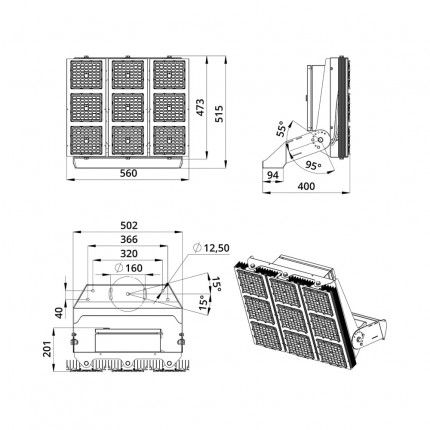Также это исполнение имеет поворотные модули, которые можно ориентировать независимо друг от друга в разных направлениях. Количество модулей варьируется в зависимости от мощности светильника.