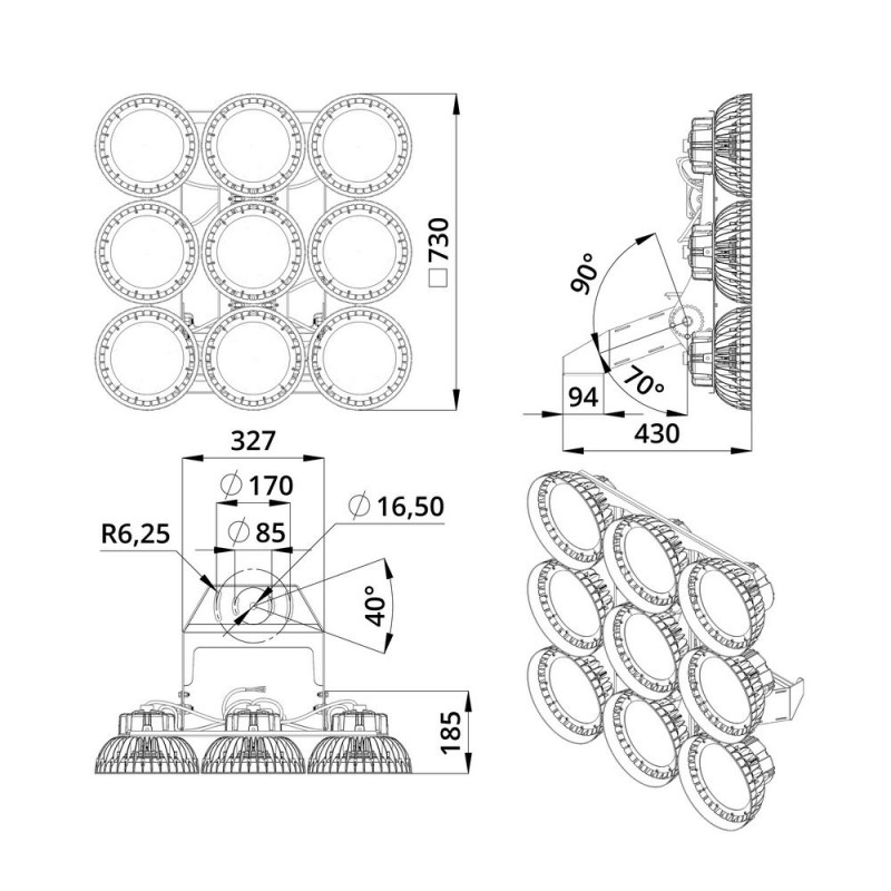 Прожекторы имеют малые габаритную высоту и вес, что снижает ветровую и весовую нагрузку на опорные конструкции.