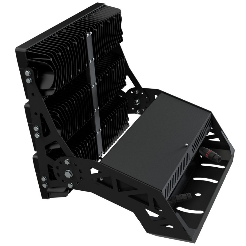 За счет конструкции радиаторной части прожекторы мощностью 400 и 500 Вт на один модуль имеют оптимальное сочетание массы, габаритов и цены за люмен, что особенно важно при выборе светильников для установки на высокомачтовые опоры.