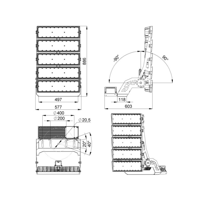 За счет конструкции радиаторной части прожекторы мощностью 400 и 500 Вт на один модуль имеют оптимальное сочетание массы, габаритов и цены за люмен, что особенно важно при выборе светильников для установки на высокомачтовые опоры.