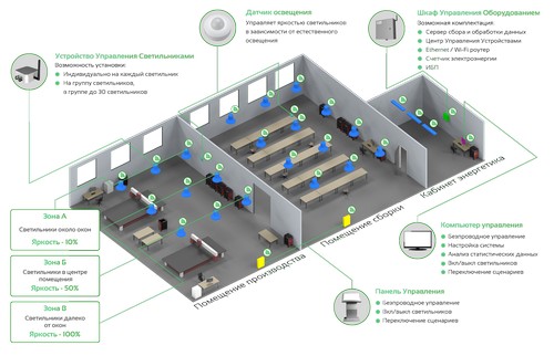 В системе предусмотрены варианты управления как одним отдельным светильником, так и группой или всем освещением сразу.Масштабируемость системы