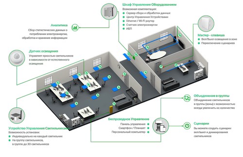 В системе предусмотрены варианты управления как одним отдельным светильником, так и группой или всем освещением сразу.Масштабируемость системы