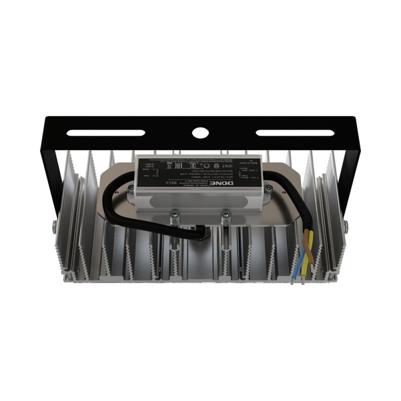 Источник питания наружного исполнения, его металлический корпус залит теплопроводящим компаундом. Это снижает температуру на элементах источника питания, увеличивая срок его службы. Кроме того, за счёт наружного исполнения источника снижается нагрев светодиодного модуля, и сам светильник служит дольше.