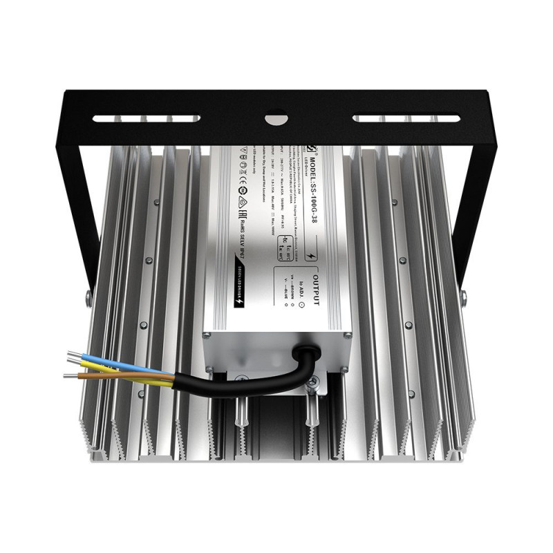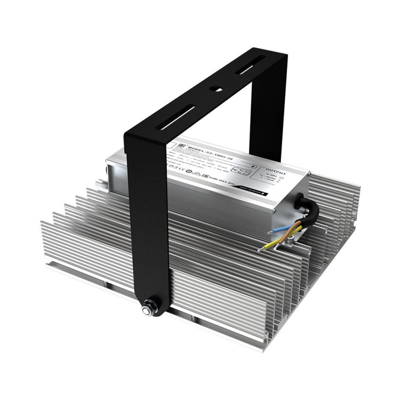 Источник питания наружного исполнения, его металлический корпус залит теплопроводящим компаундом. Это снижает температуру на элементах источника питания, увеличивая срок его службы. Кроме того, за счёт наружного исполнения источника снижается нагрев светодиодного модуля, и сам светильник служит дольше.