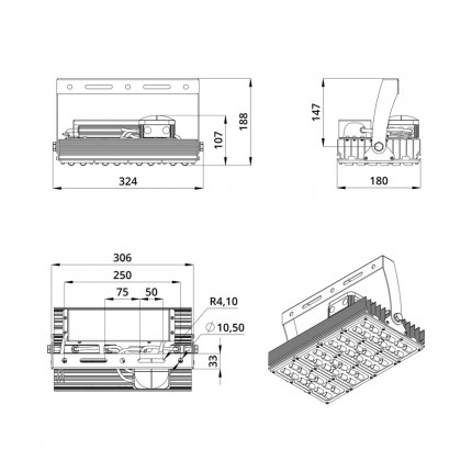 В комплекте идёт кронштейн, который позволяет регулировать угол наклона прожектора. Специальные зубцы на кронштейнах (для светильников 200-300 Вт) дополнительно облегчают регулировку положения прожектора.