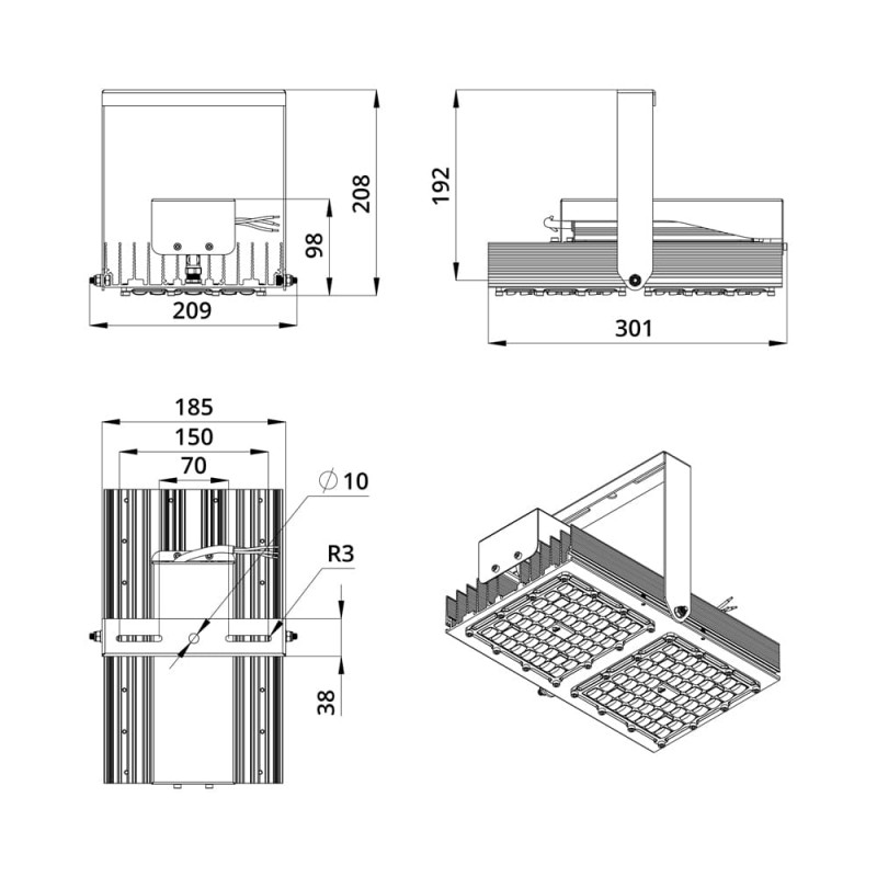 В комплекте идёт кронштейн, который позволяет регулировать угол наклона прожектора. Специальные зубцы на кронштейнах (для светильников 200-300 Вт) дополнительно облегчают регулировку положения прожектора.