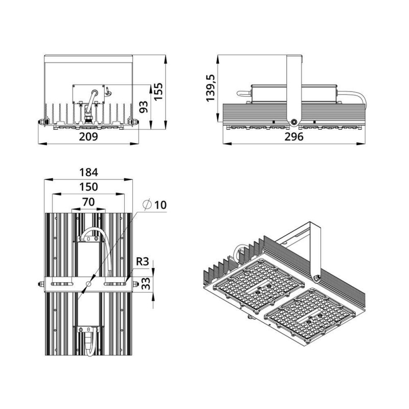 В комплекте идёт кронштейн, который позволяет регулировать угол наклона прожектора. Специальные зубцы на кронштейнах (для светильников 200-300 Вт) дополнительно облегчают регулировку положения прожектора.