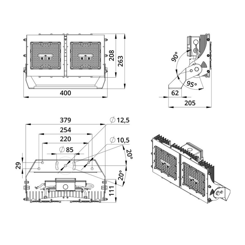 В комплекте идёт кронштейн, который позволяет регулировать угол наклона прожектора. Специальные зубцы на кронштейнах (для светильников 200-300 Вт) дополнительно облегчают регулировку положения прожектора.