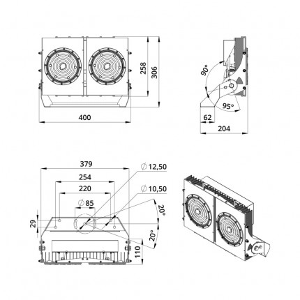 В комплекте идёт кронштейн, который позволяет регулировать угол наклона светильников. Специальные зубцы на кронштейнах (для светильников 200-300 Вт) дополнительно облегчают регулировку положения прожектора.