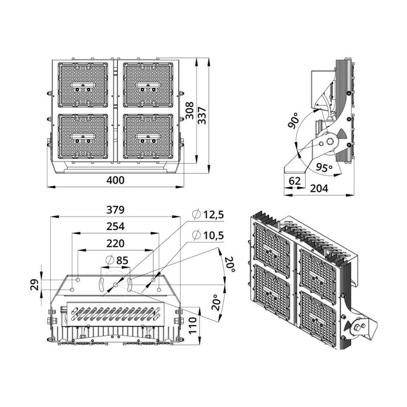 В комплекте идёт кронштейн, который позволяет регулировать угол наклона прожектора. Специальные зубцы на кронштейнах (для светильников 200-300 Вт) дополнительно облегчают регулировку положения прожектора.