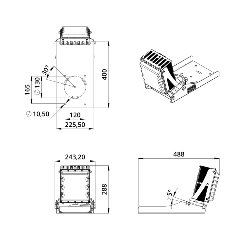 Специальный кронштейн с очень точной системой регулировки наклона имеет широкое основание, на котором крепятся источник питания и распределительная коробка.