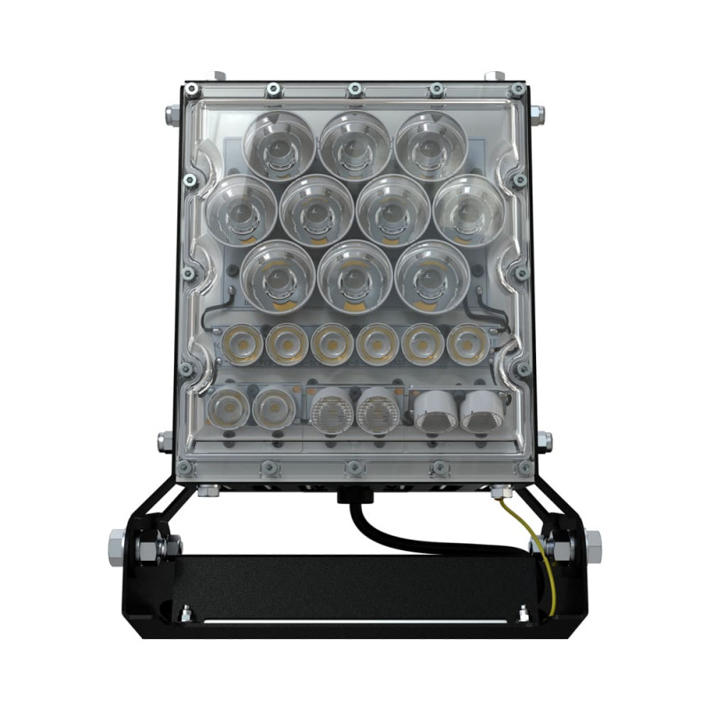 Прожектор имеет 5 светодиодных модулей, каждый из которых представляет собой алюминиевую плату с установленными светодиодами и индивидуальными линзами.