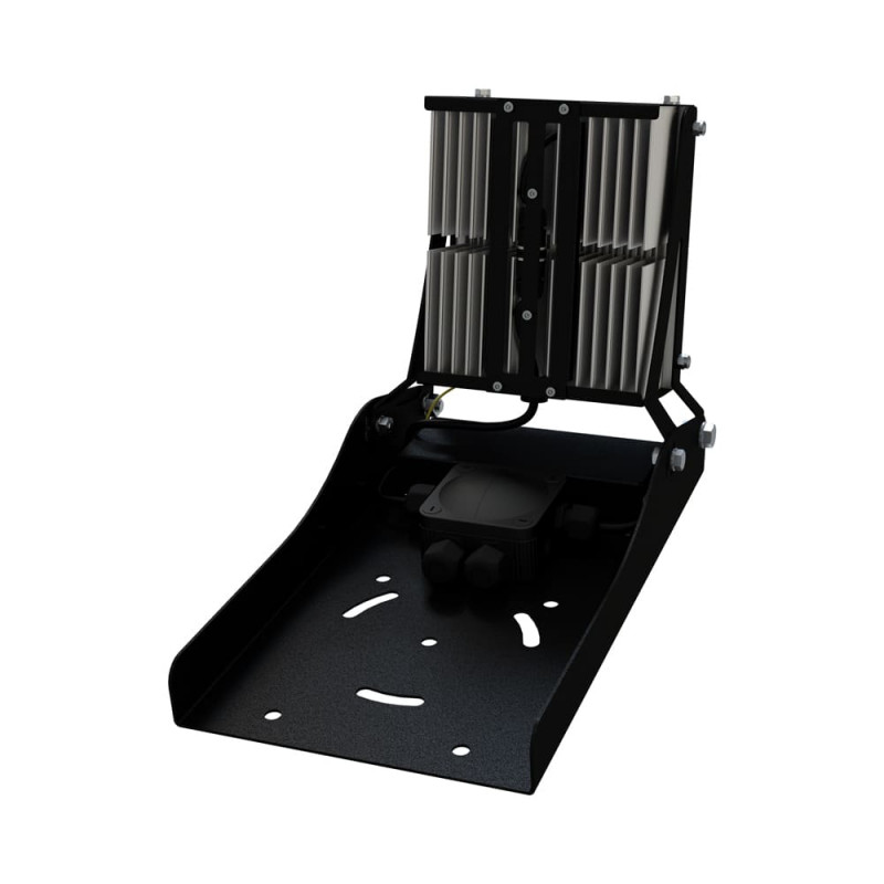 Специальный кронштейн с очень точной системой регулировки наклона имеет широкое основание, на котором крепятся источник питания и распределительная коробка.