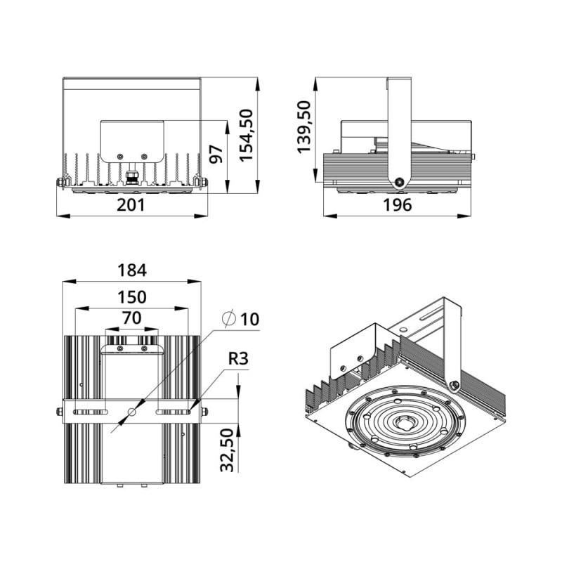 В комплекте идёт кронштейн, который позволяет регулировать угол наклона светильников. Специальные зубцы на кронштейнах (для светильников 200-300 Вт) дополнительно облегчают регулировку положения прожектора.