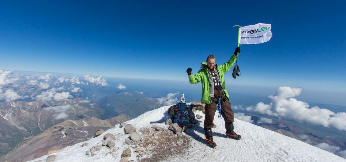 12 июля 2021 года над западной вершиной Эльбруса (5642 метра над уровнем моря) поднялся флаг PromLED. Его туда доставил наш инженер-конструктор Егор Болдовский.