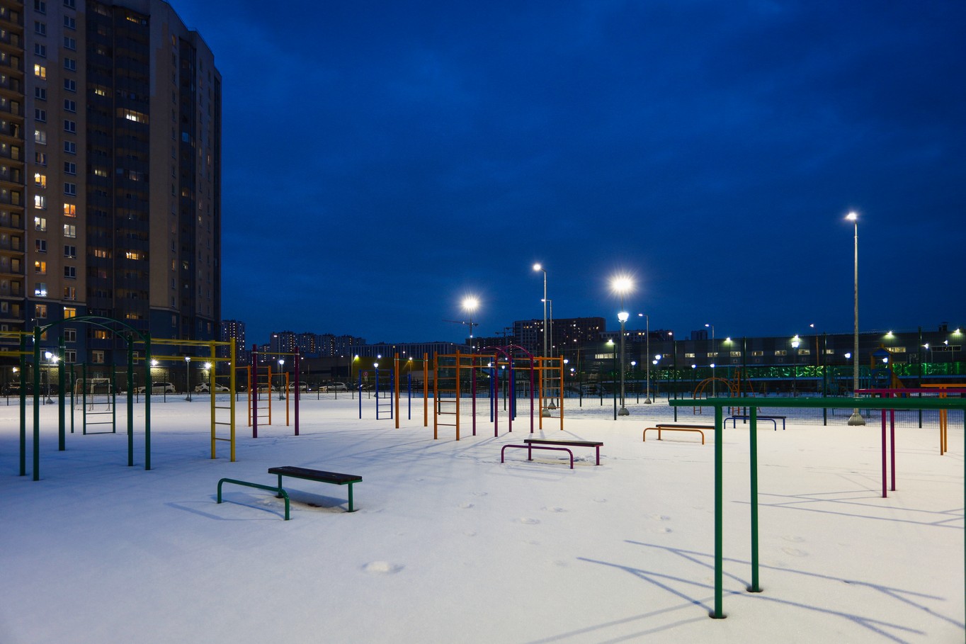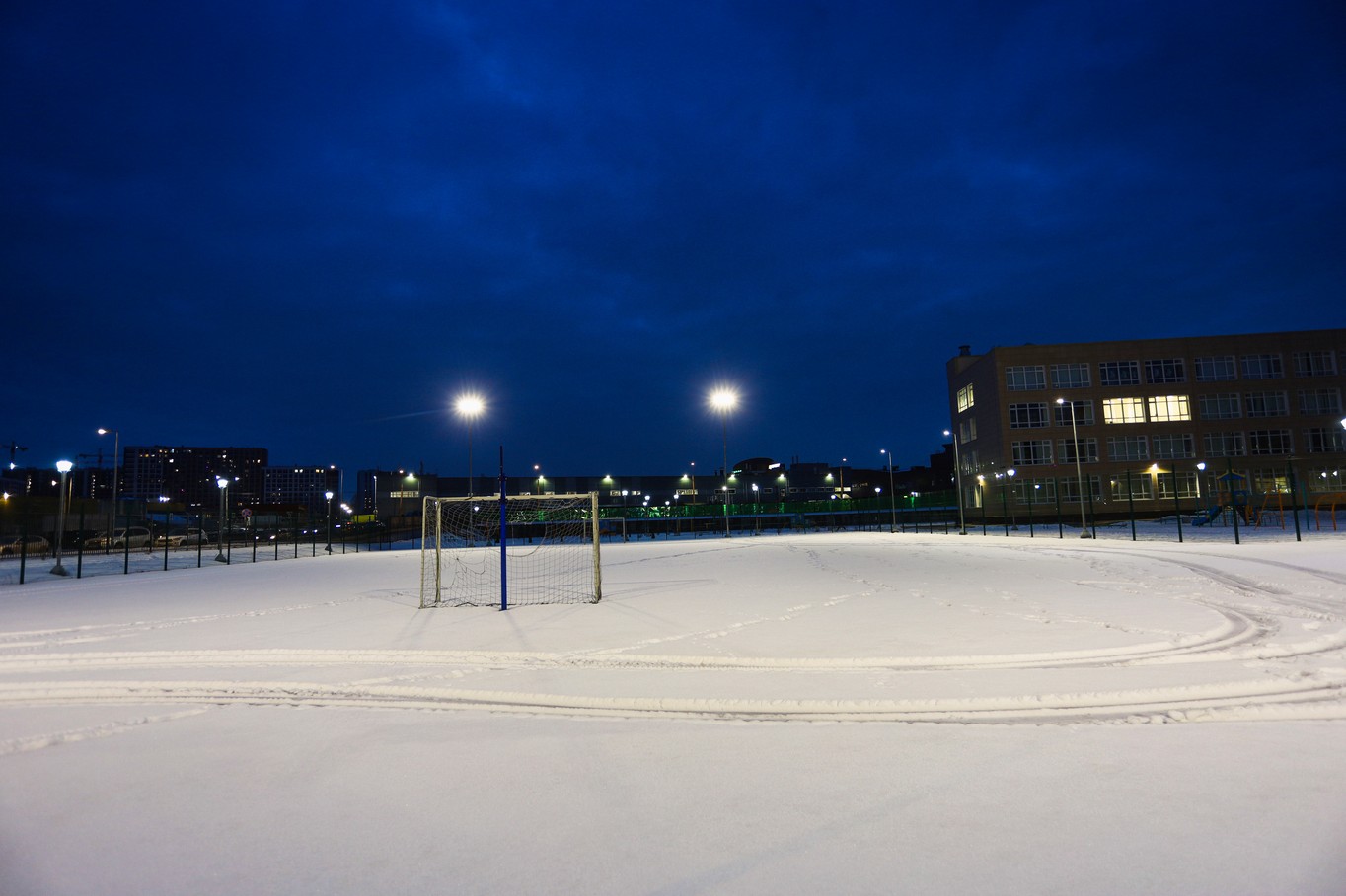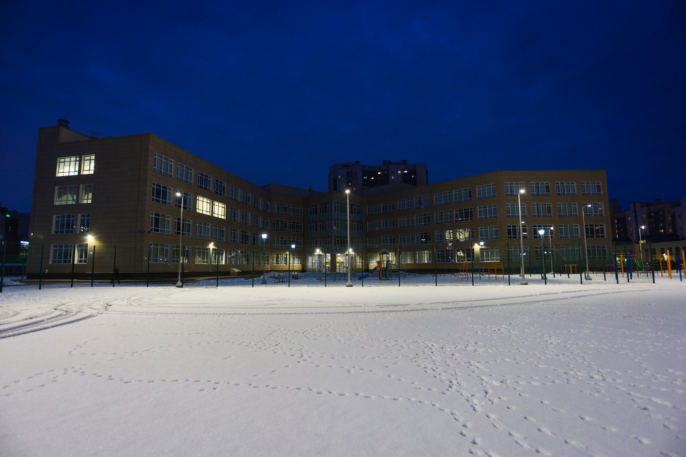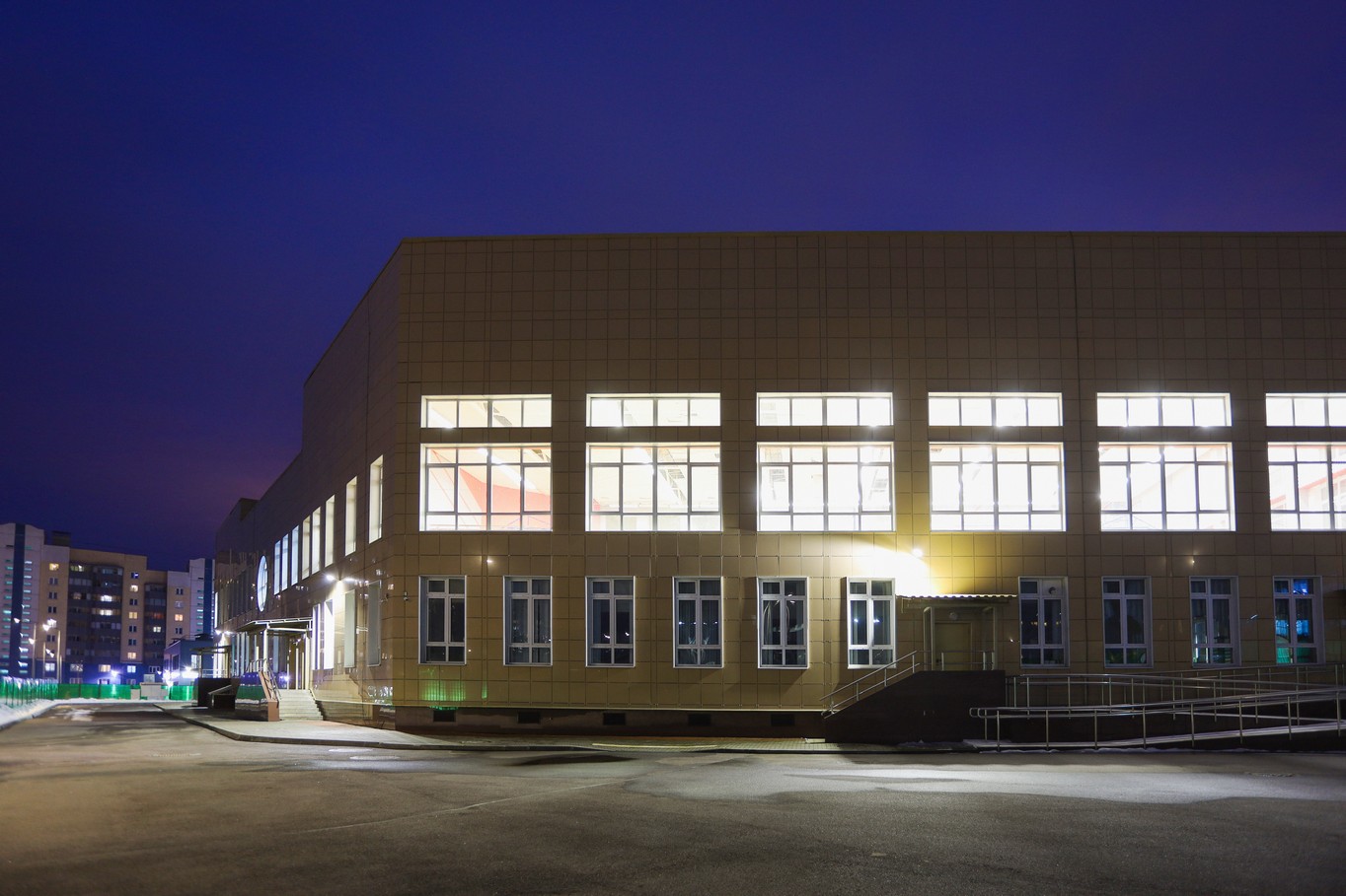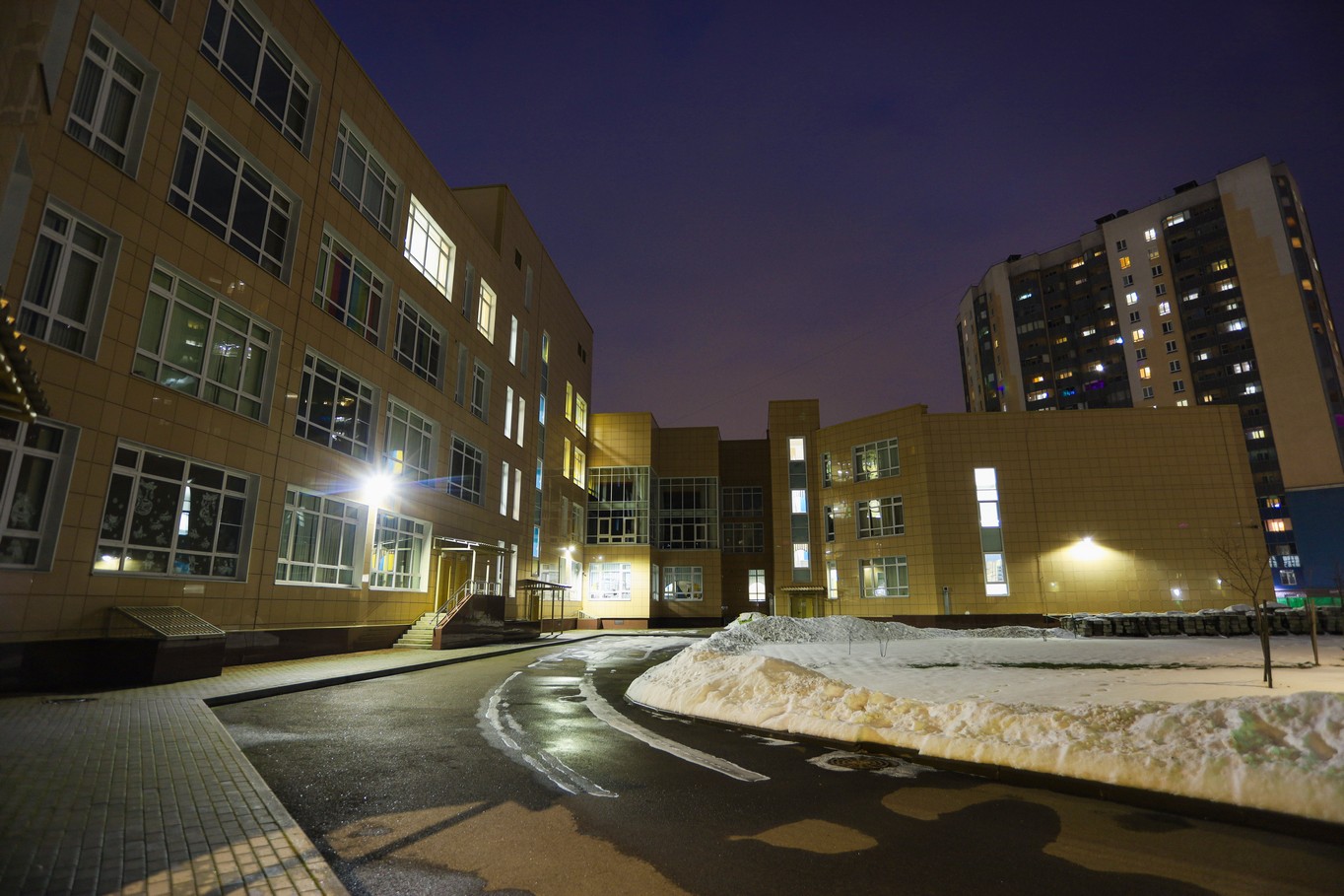 для освещения футбольного поля были подобраны светильники серии «Прожектор D», а для освещения внутренней территории школы — уличные консольные светильники «Магистраль v2.0».
