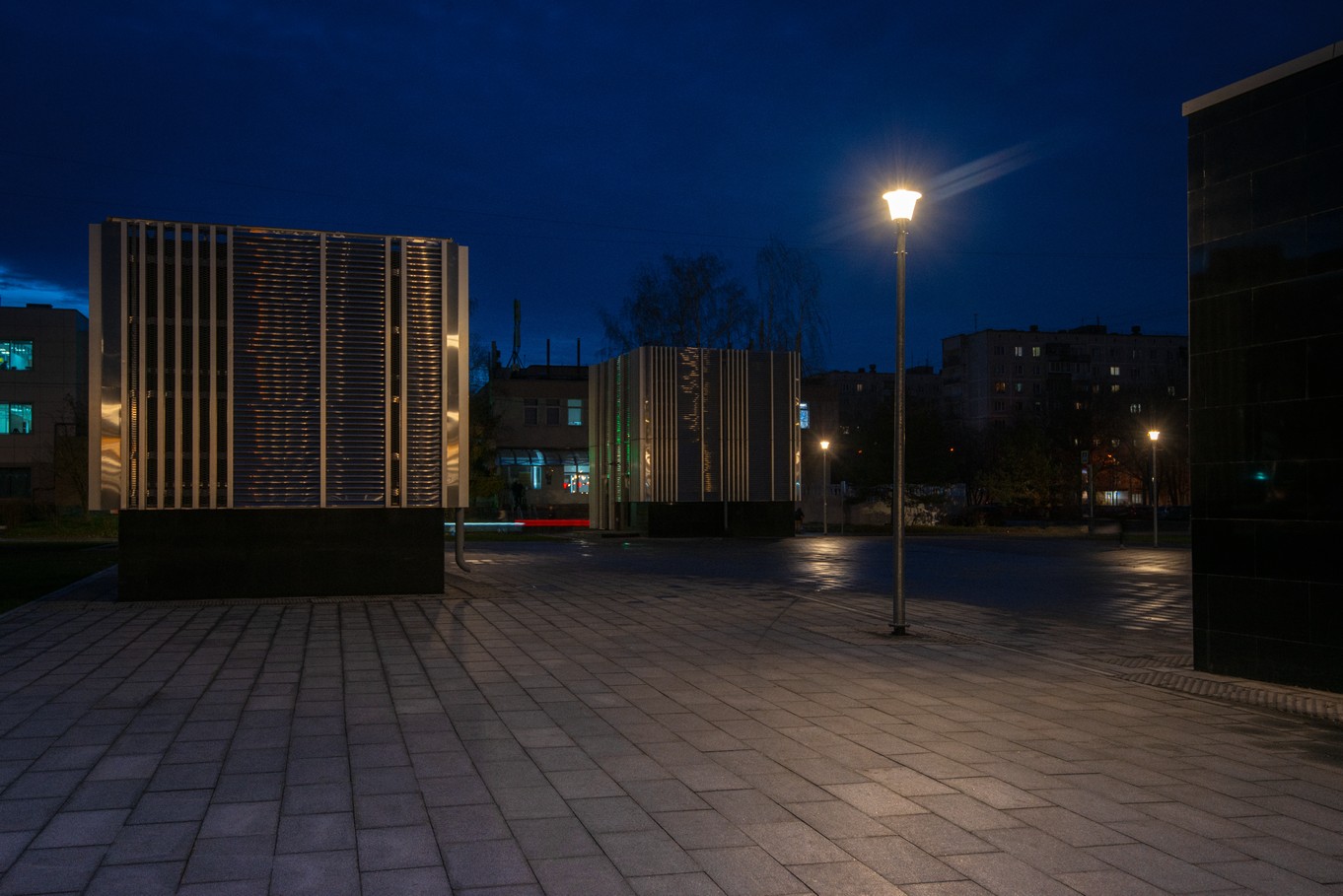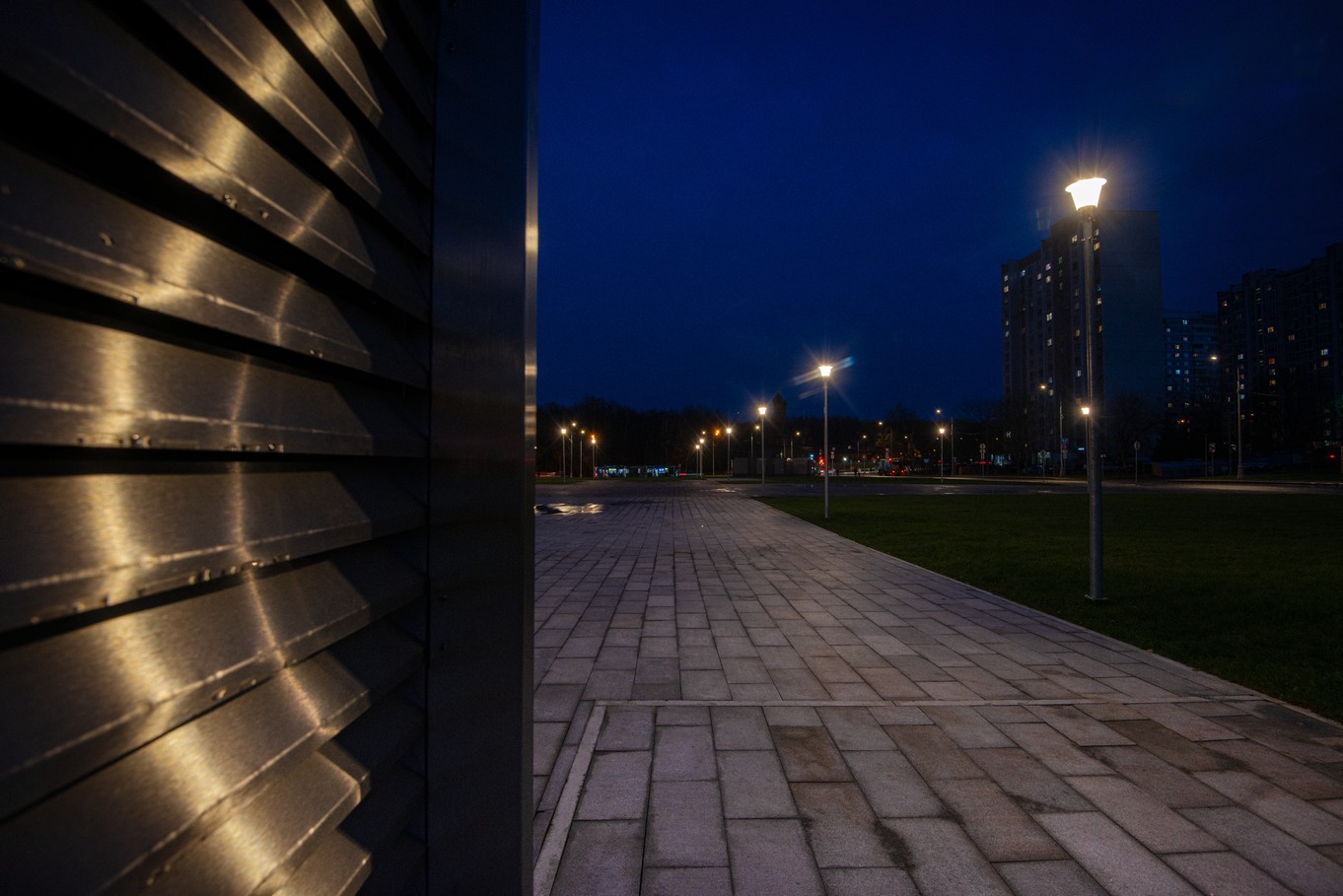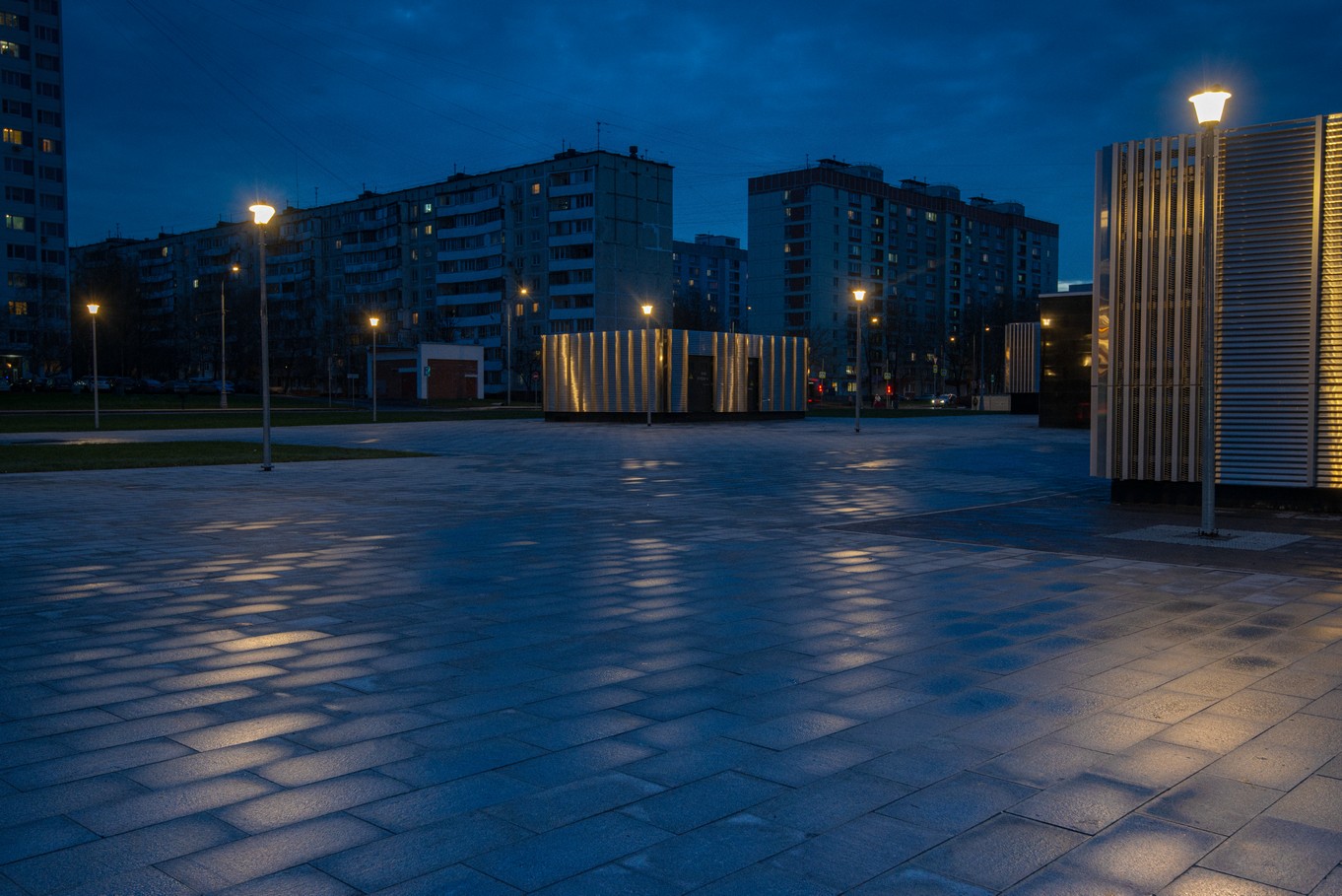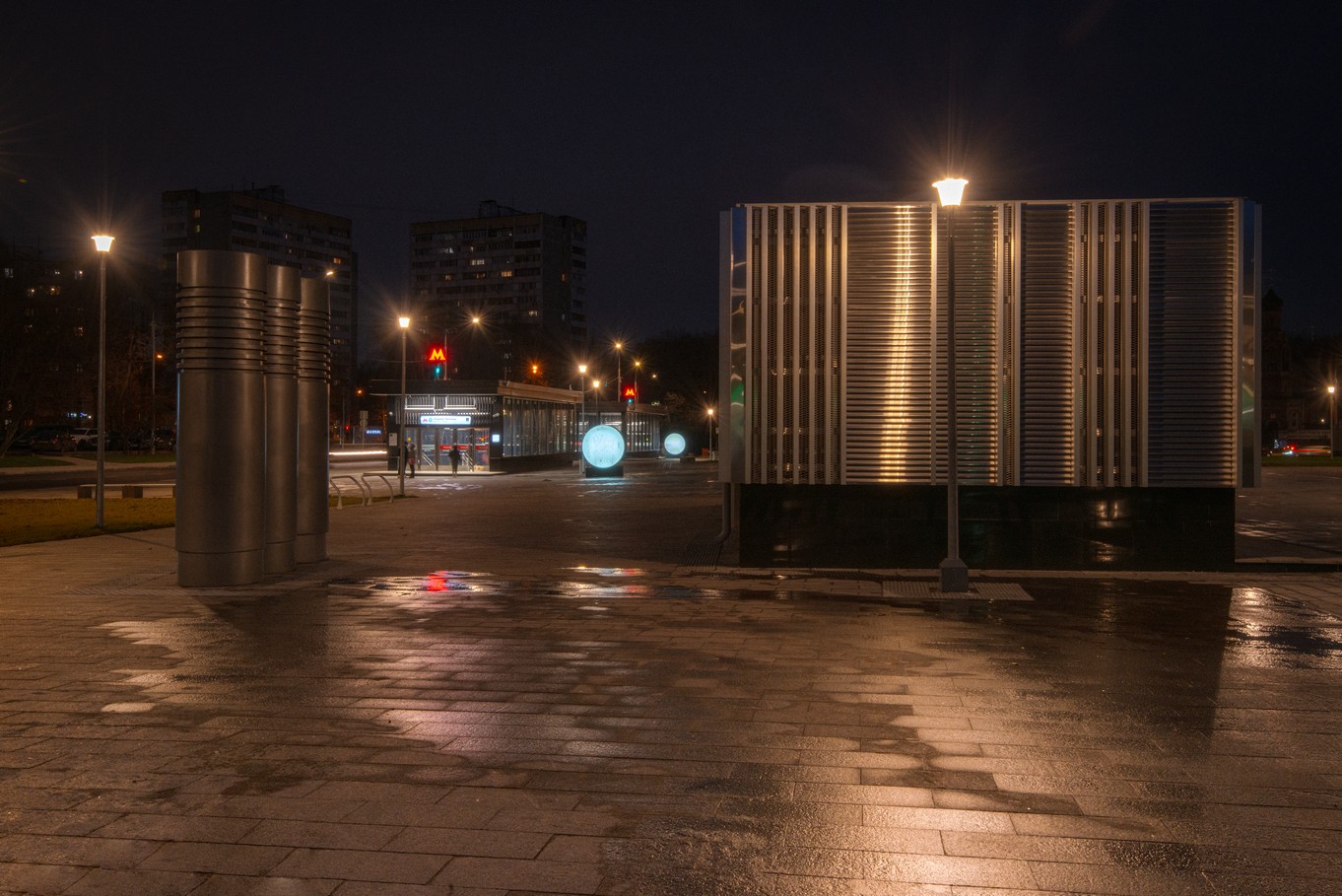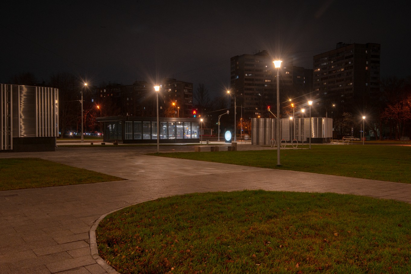 Освещение территории, прилежащей к станции метро, парковыми светильниками с современным дизайном.