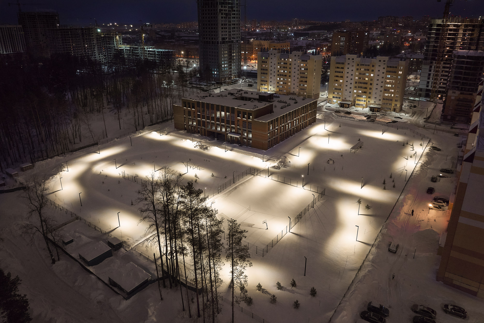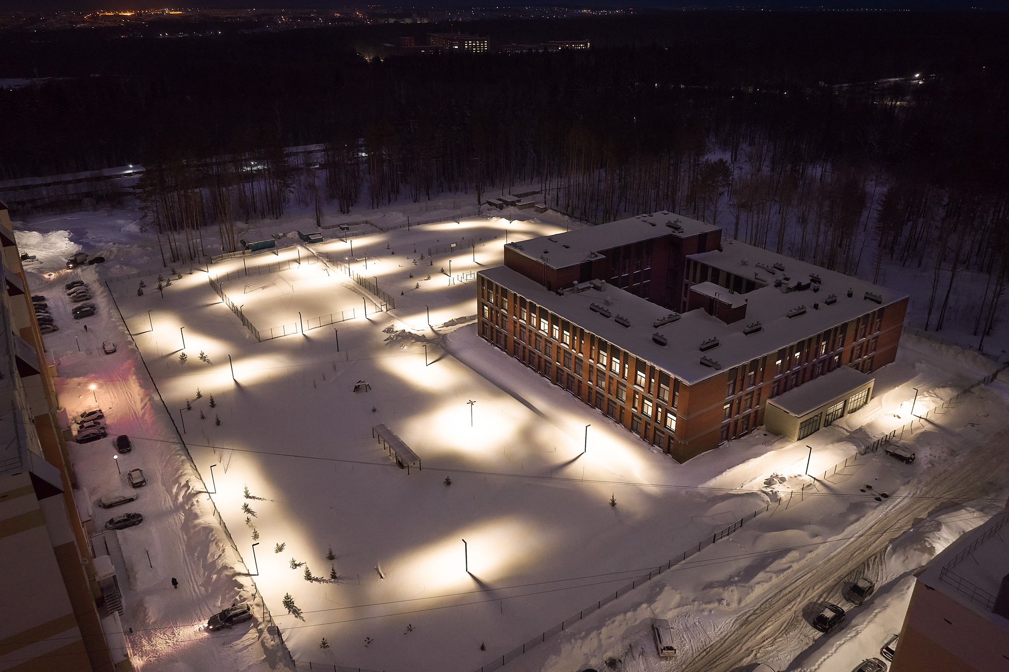 Во внутреннем дворе школы взамен устаревших светильников с лампами ДРЛ и ДНаТ были установлены «Грозы» в модели S.