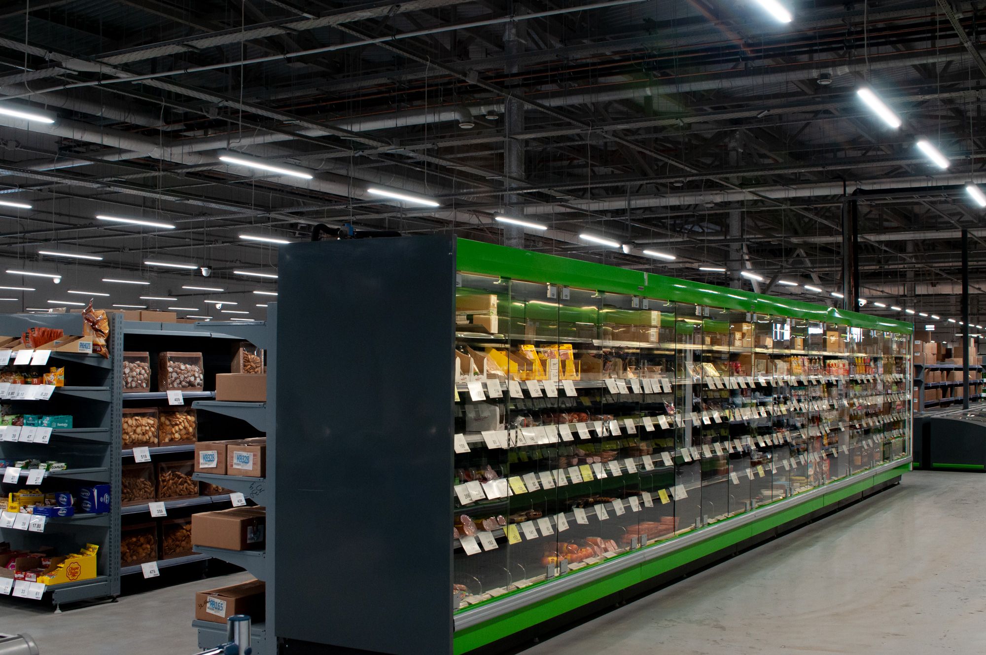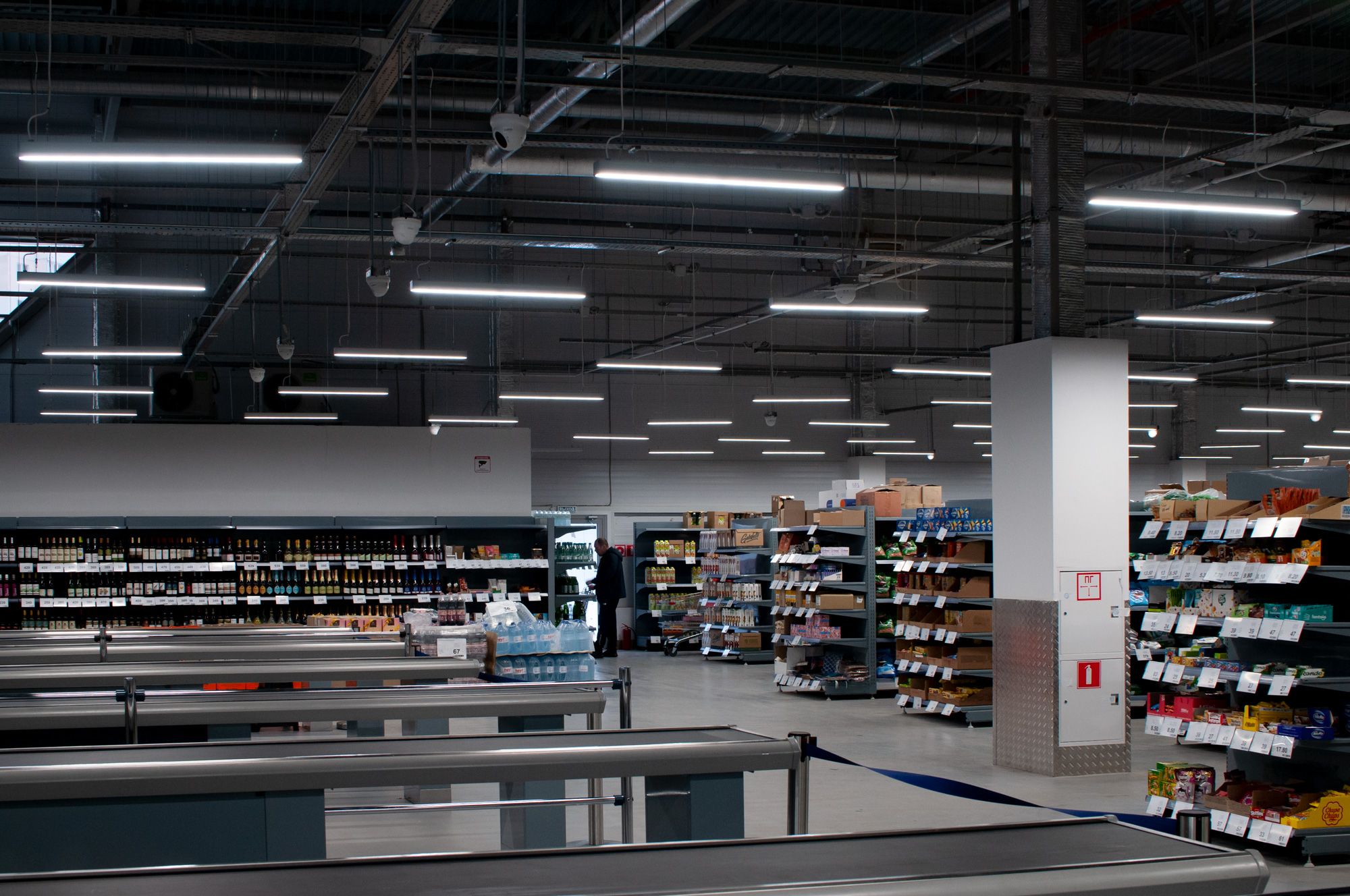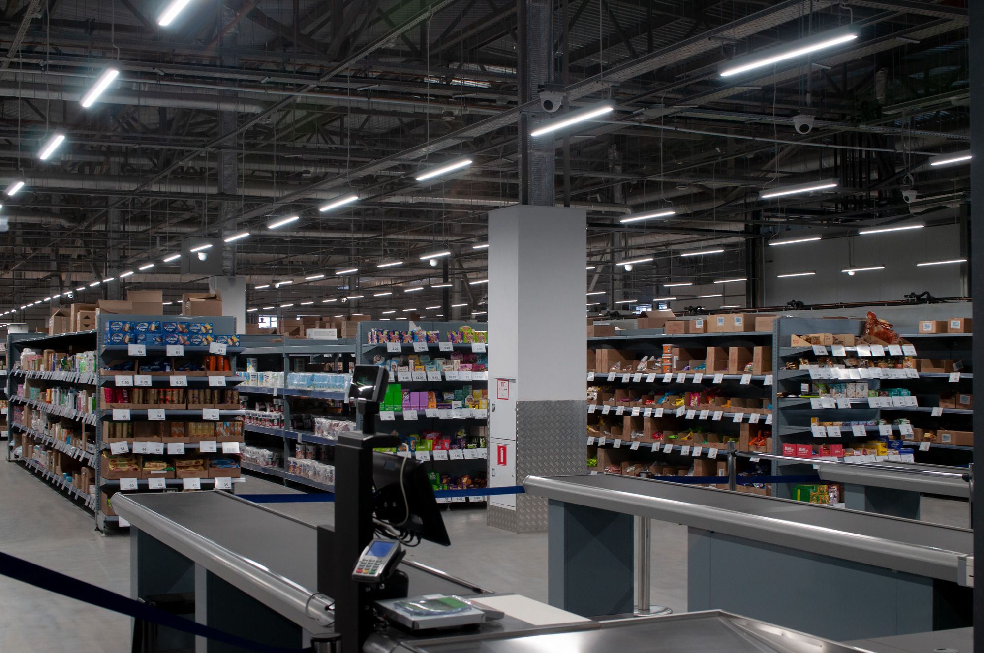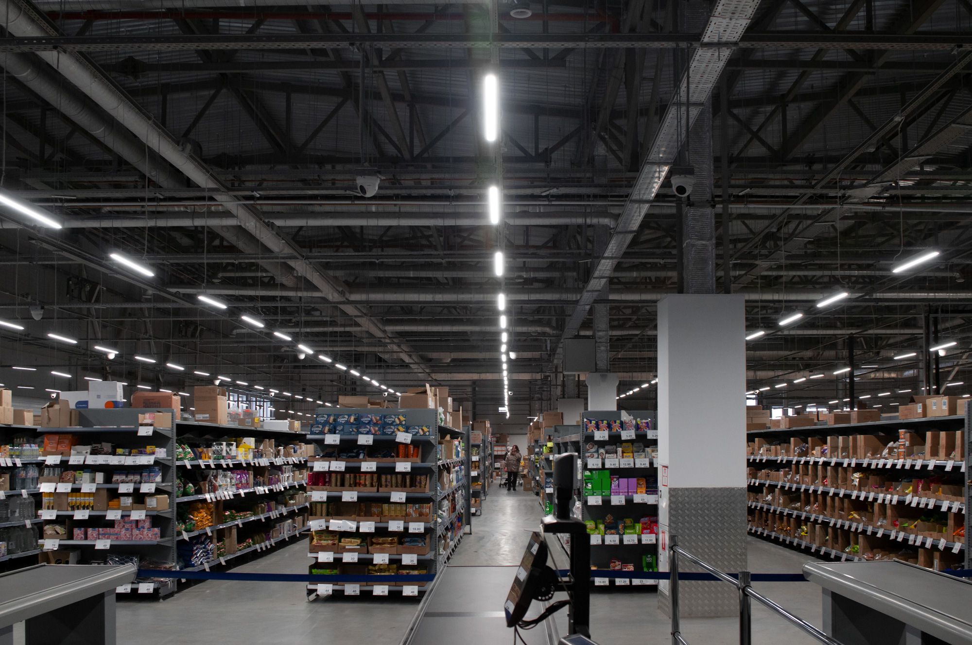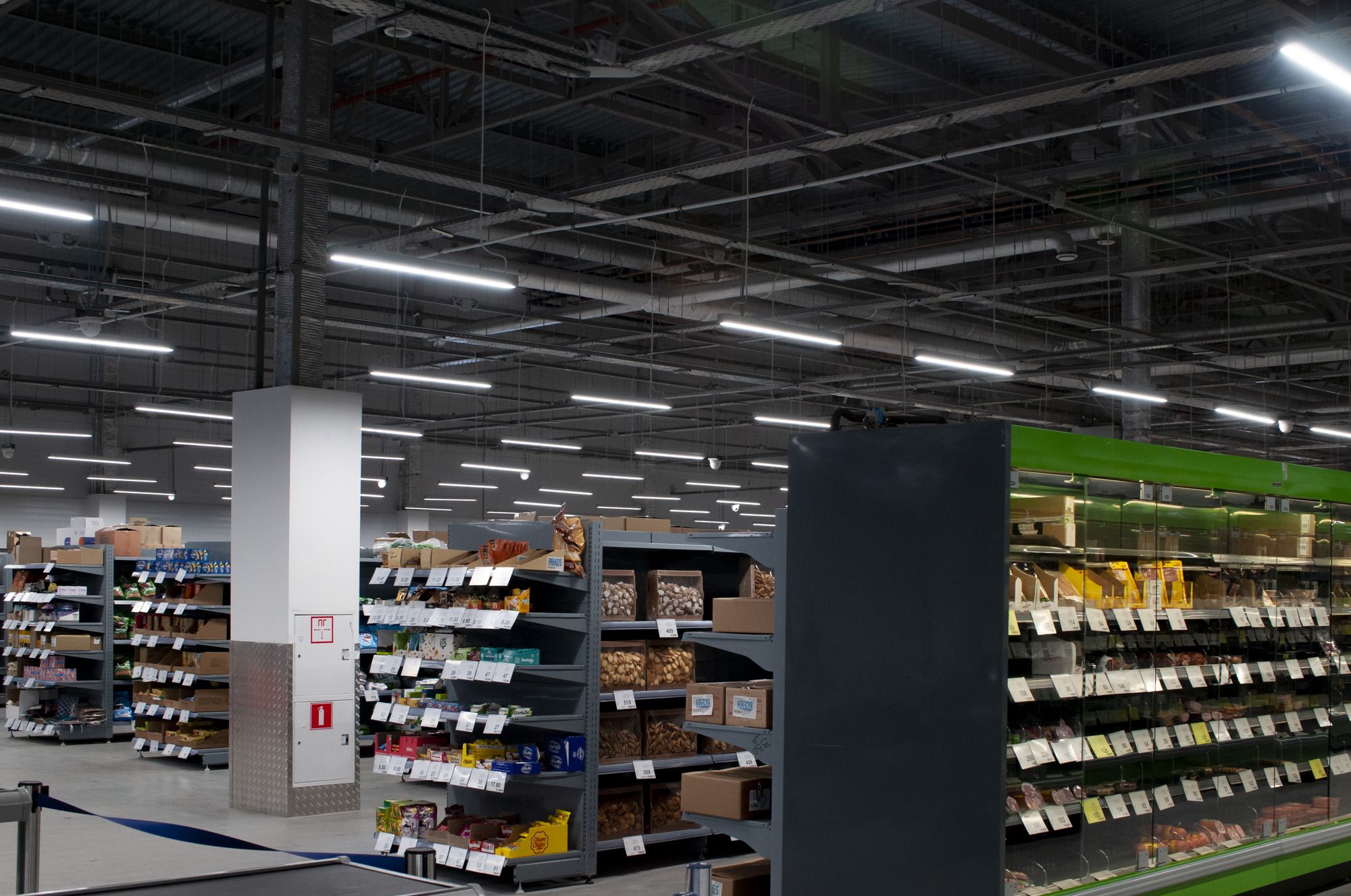 Поставленная задача: осветить торговые павильоны и складские зоны супермаркета, добиться горизонтальной освещённости на полу 500 лк.