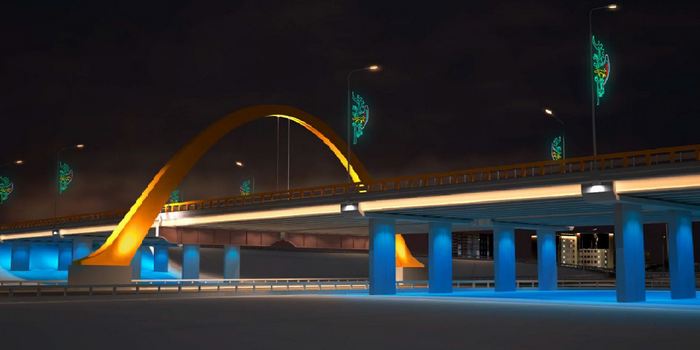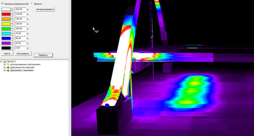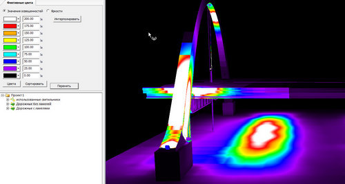 - Подсветка объекта предусматривала дополнительную установку трех опор освещения: одной непосредственно между дорожными полотнами, еще двух — снизу по бокам арочного пилона.