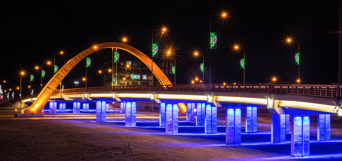 - Подсветка объекта предусматривала дополнительную установку трех опор освещения: одной непосредственно между дорожными полотнами, еще двух — снизу по бокам арочного пилона.