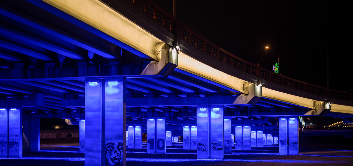 Для контурной подсветки виадука используются линейные светодиодные светильники «Барокко» с цветовой температурой 4000 К, заливающее освещение арочного пилона реализуется «Прожекторами S» с цветовой температурой 3000 К, опоры развязки подсвечиваются светильниками «Вико» синего цвета. Важно отметить, что перед полным согласованием светотехнического оборудования, компания PromLED отправила заказчику образцы каждого вида светильников для проведения независимых тестов.