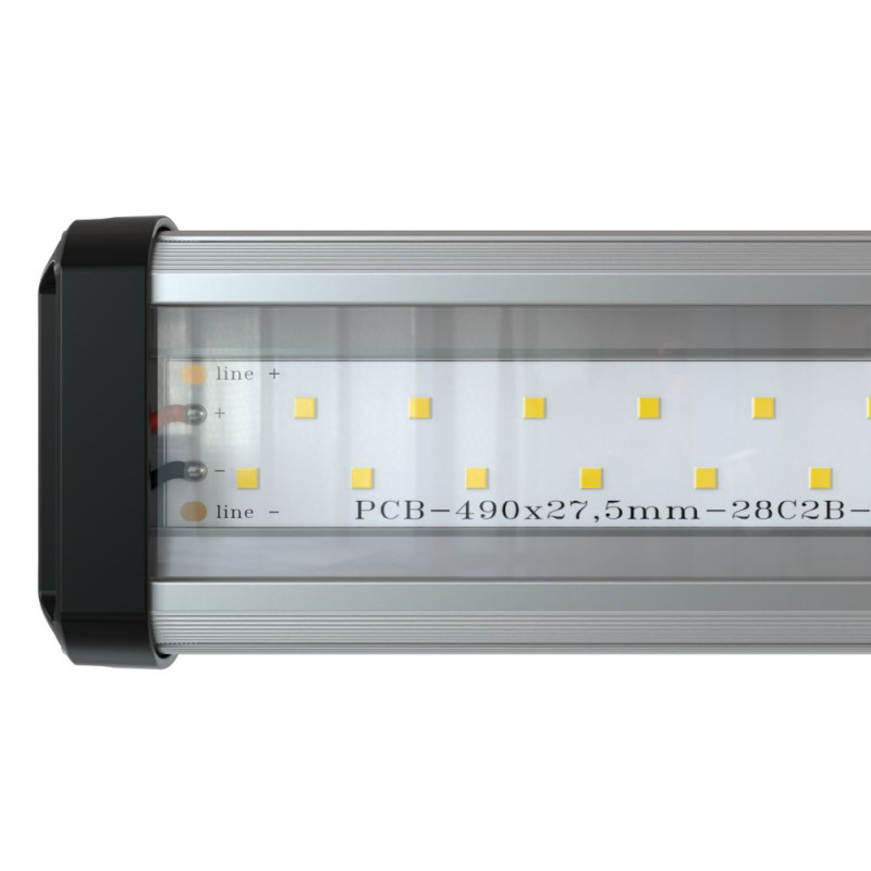 В светильниках «Т-Линия Компакт» используются светодиодные планки на специальной алюминиевой подложке, изготовленные по технологии SMT. Светодиодная планка максимально приближена к рассеивателю, чтобы сократить потери светового потока.