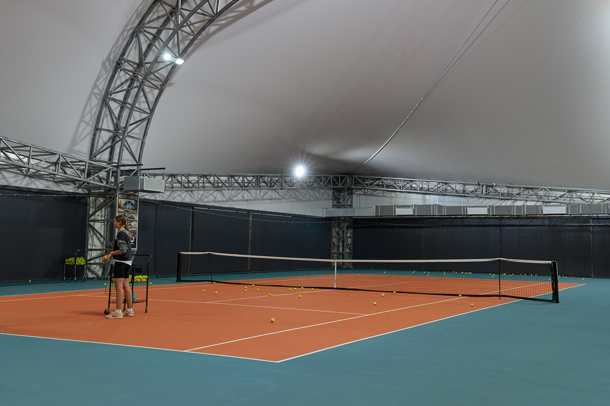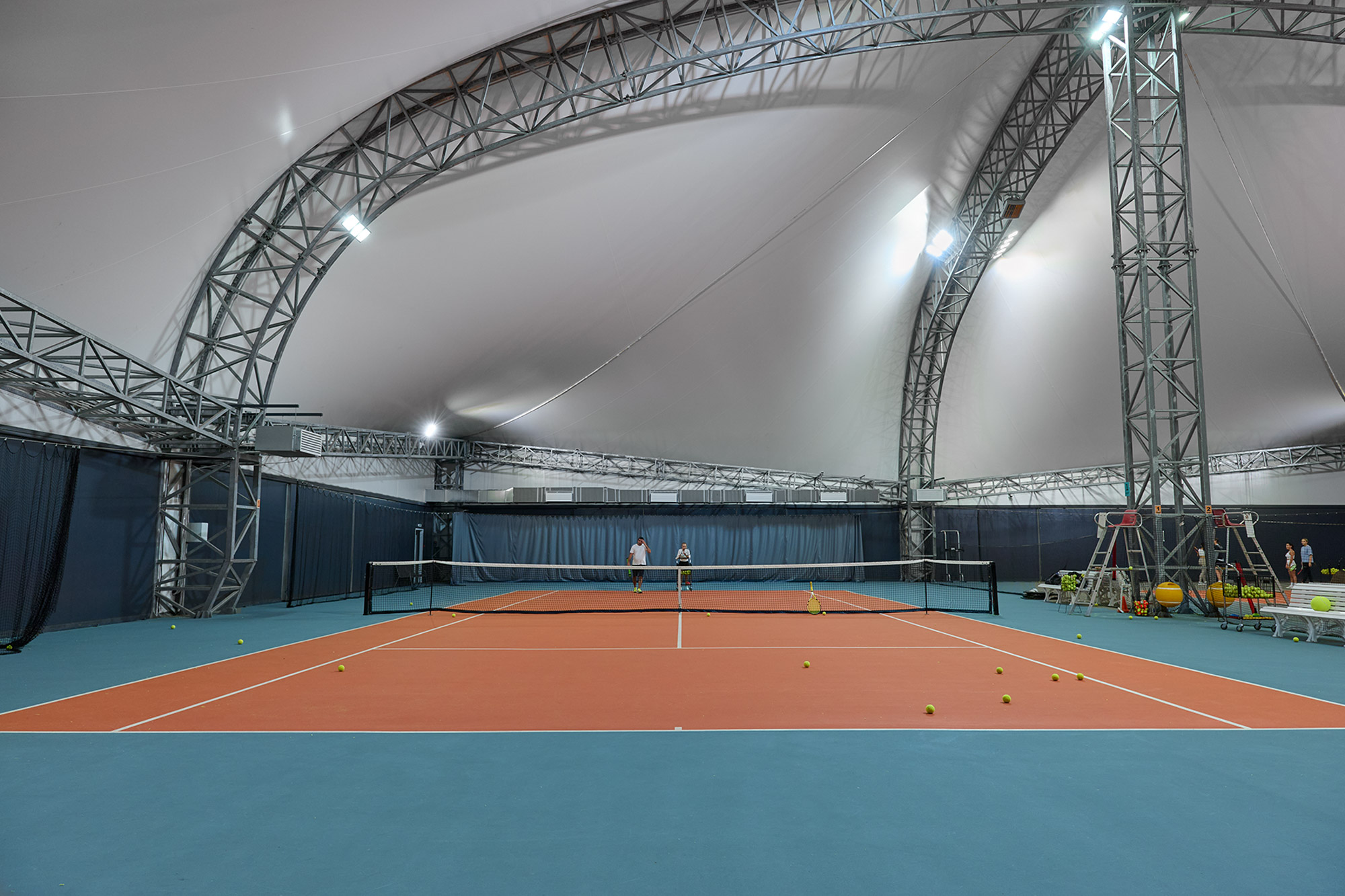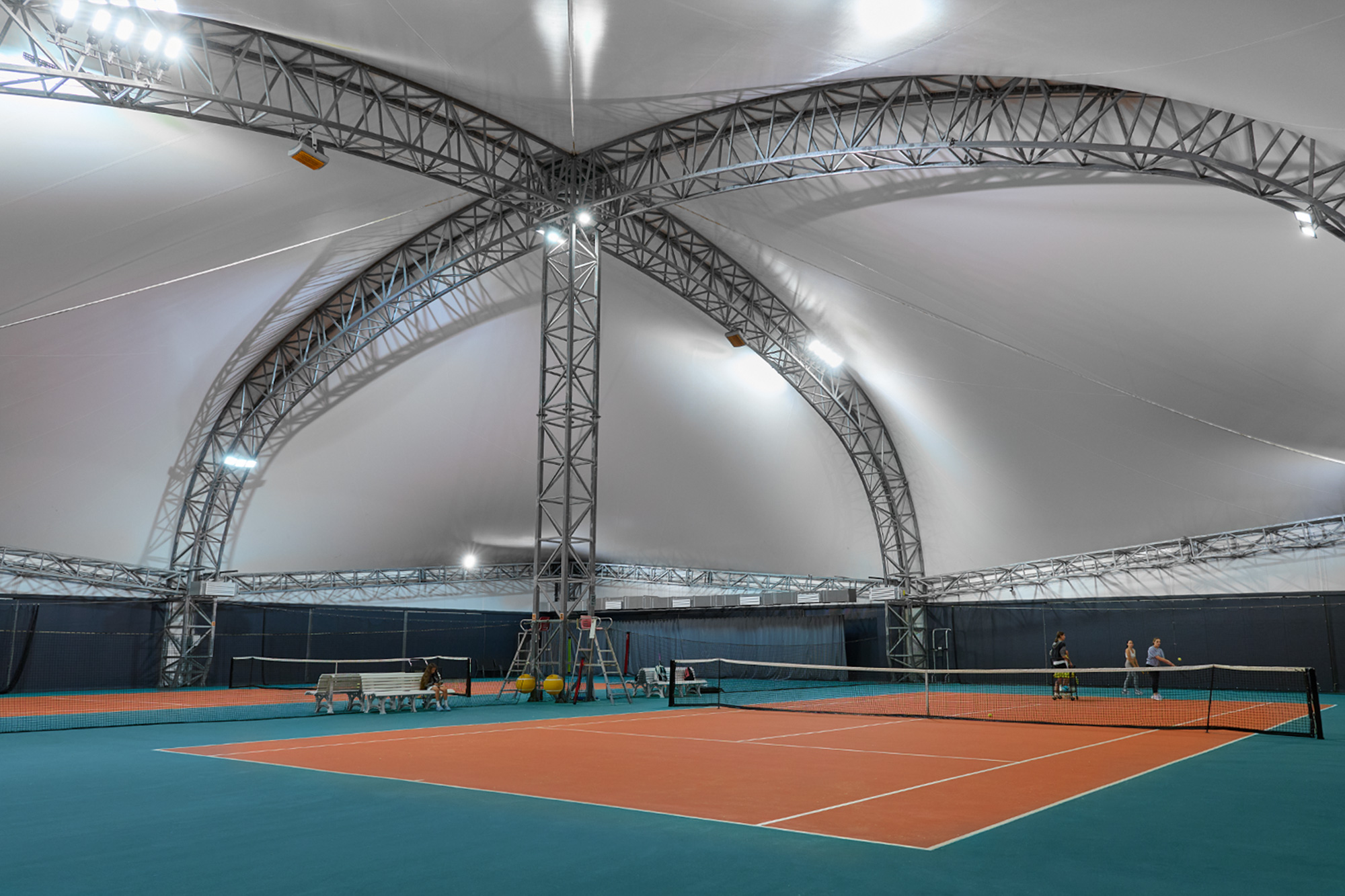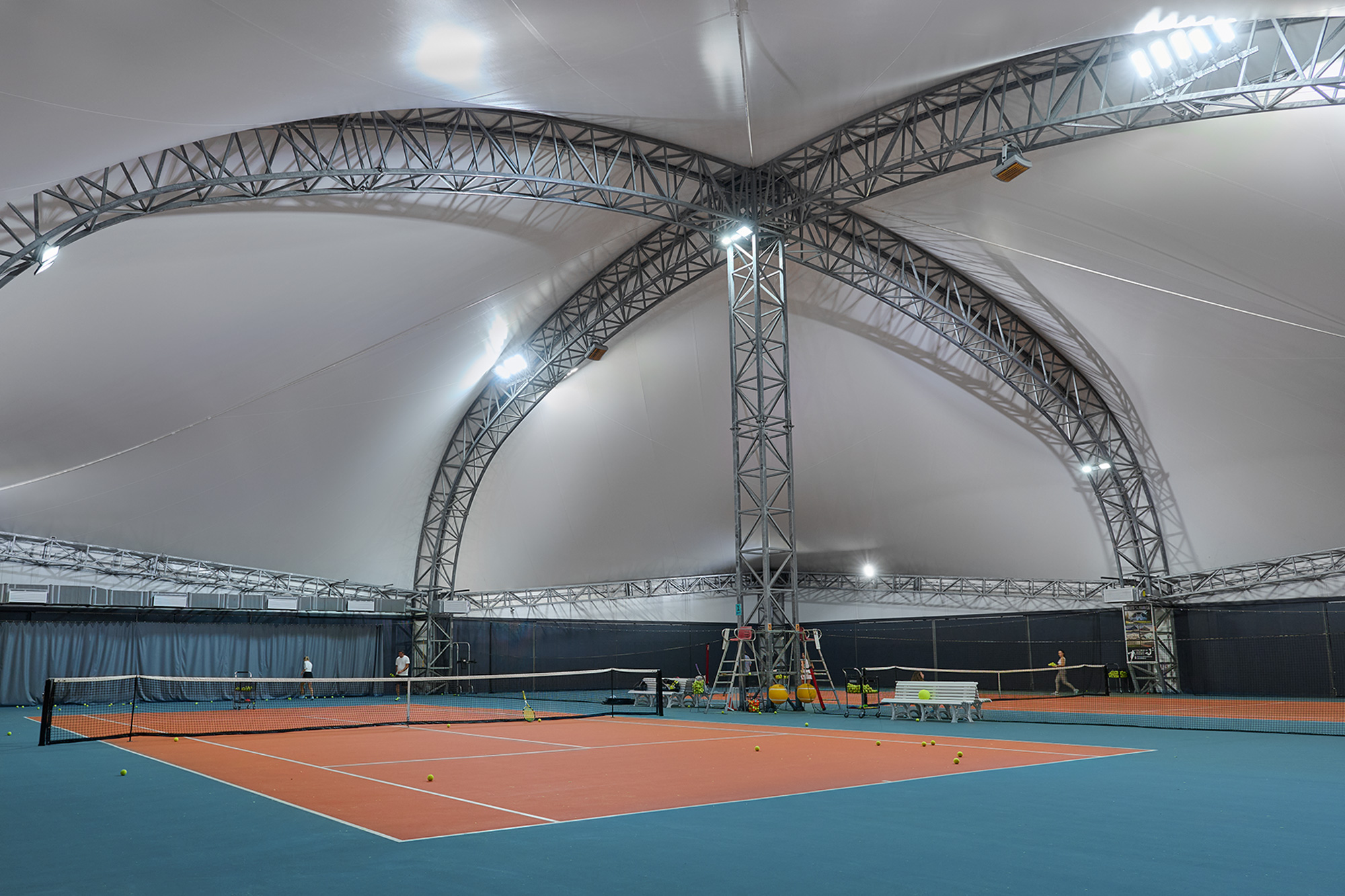 помещение крытого корта представляет собой купольный шатер, в котором было необходимо разместить светильники на опорах на высоте 8 и 14 метров.
