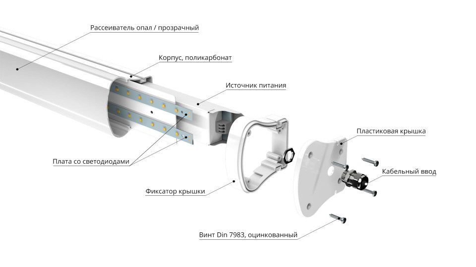 • два вида рассеивателей из УФ-стабилизированного поликарбоната: прозрачный и опаловый;