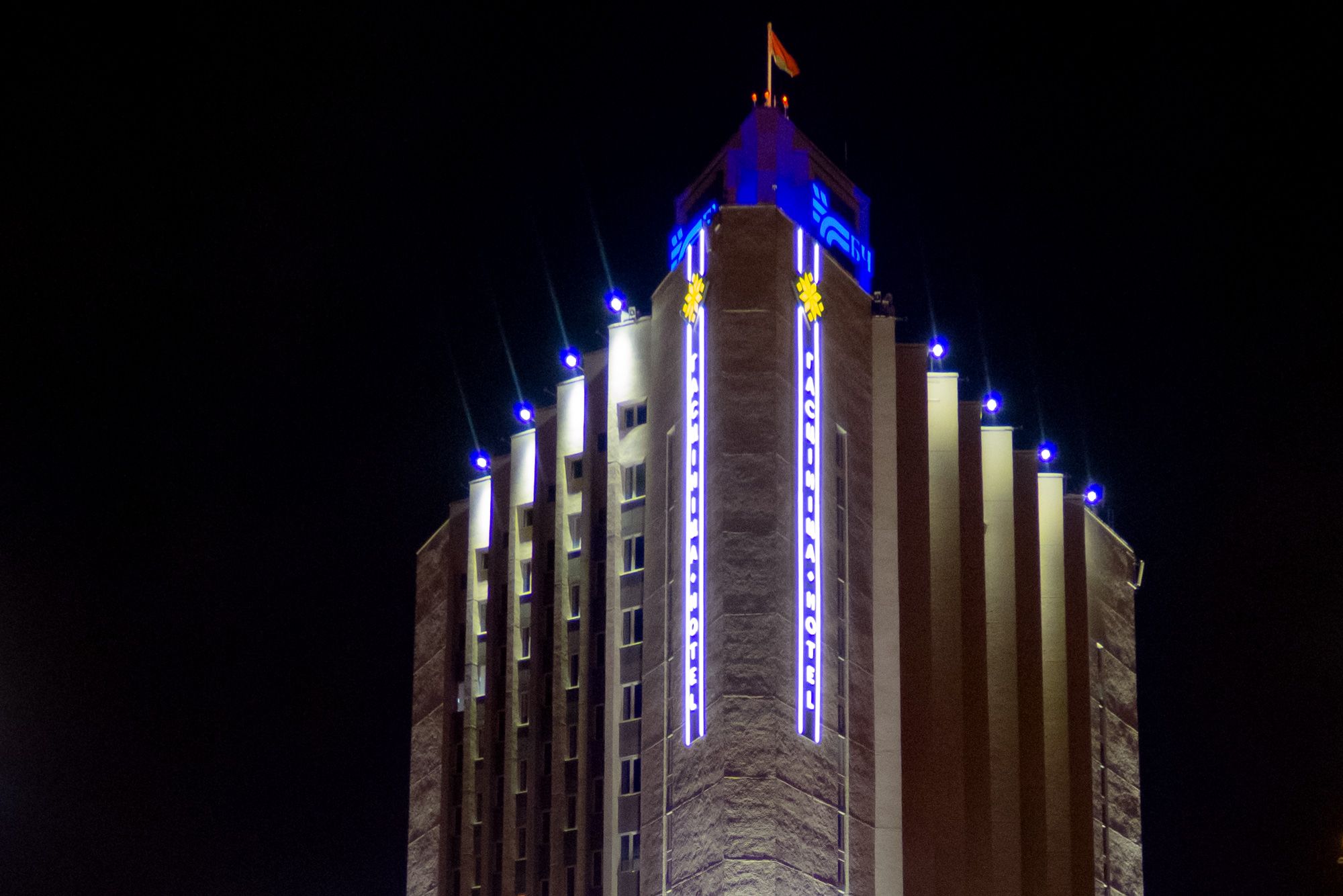 Особенности проекта: с помощью мощных узконаправленных «Плазм S» на фасаде здания созданы вертикальные световые столбы, «Прожекторы S» использованы для заливного освещения.