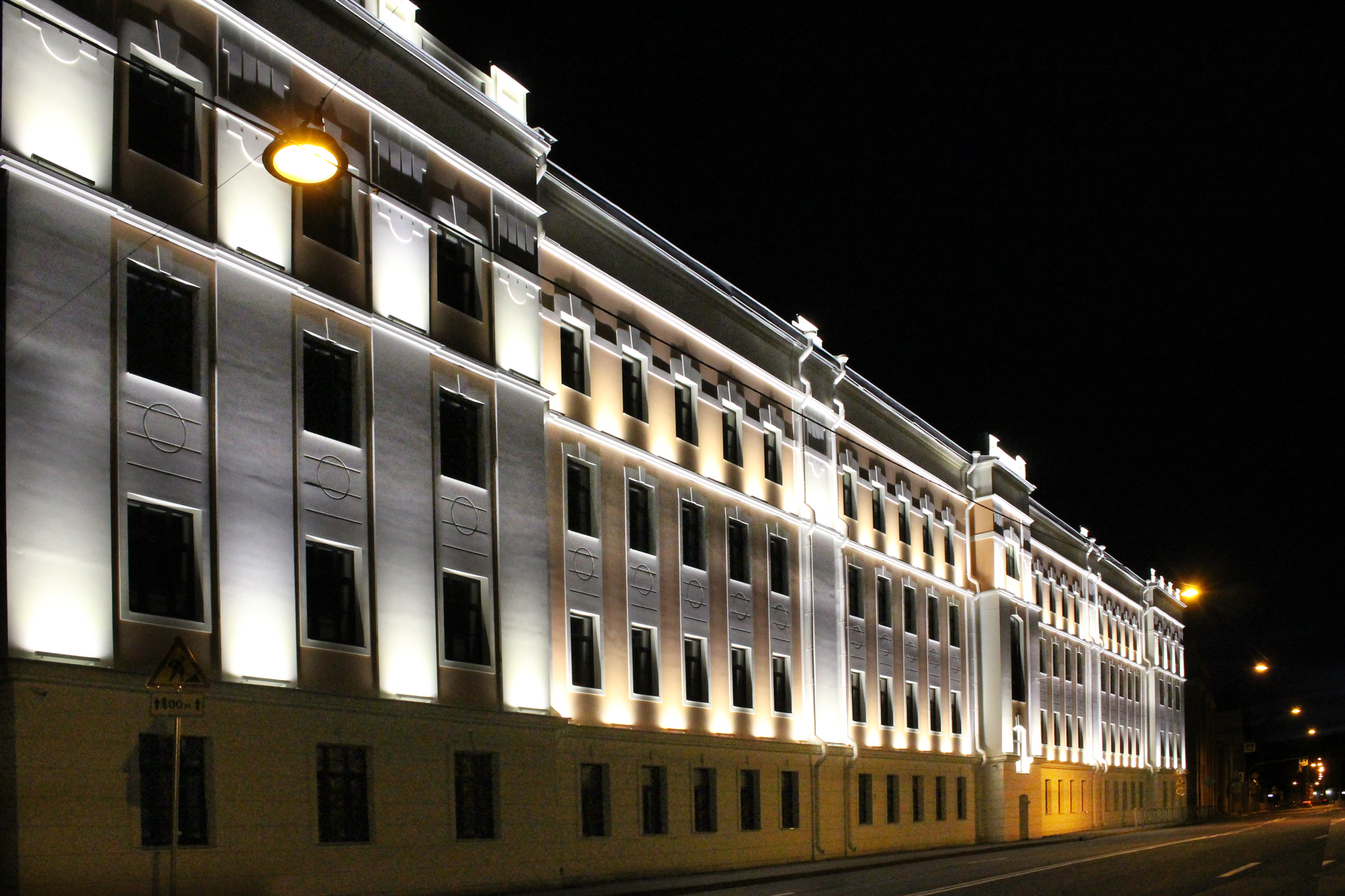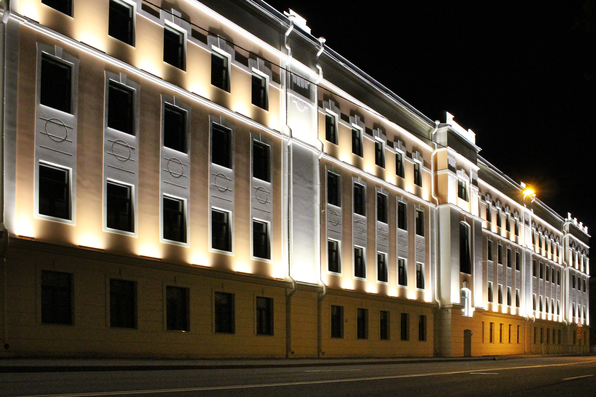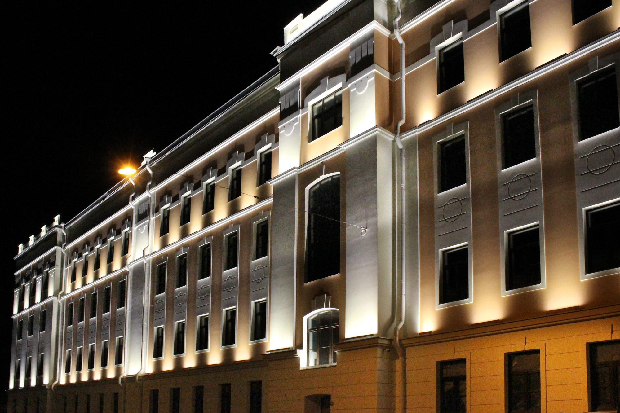 Предложенное осветительное решение: Установили светодиодные светильники ПромЛед Барокко 20 500мм Оптик 4000К 10×65° в количестве 103 шт. В соответствии с проектом осуществили заливающую подсветку архитектурных элементов башенок на кровле здания, акцентную подсветку колонных выступов, межоконных пространств, пилонов и карнизных выступов на фасаде здания. Все светильники были окрашены по техническому заданию в RAL 9002 и RAL 3012.