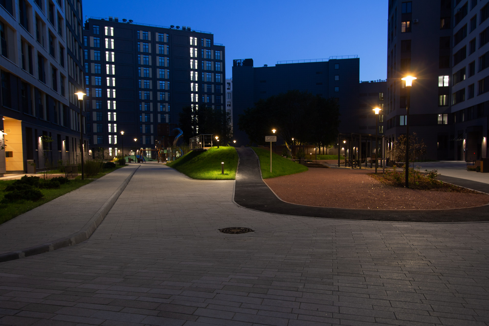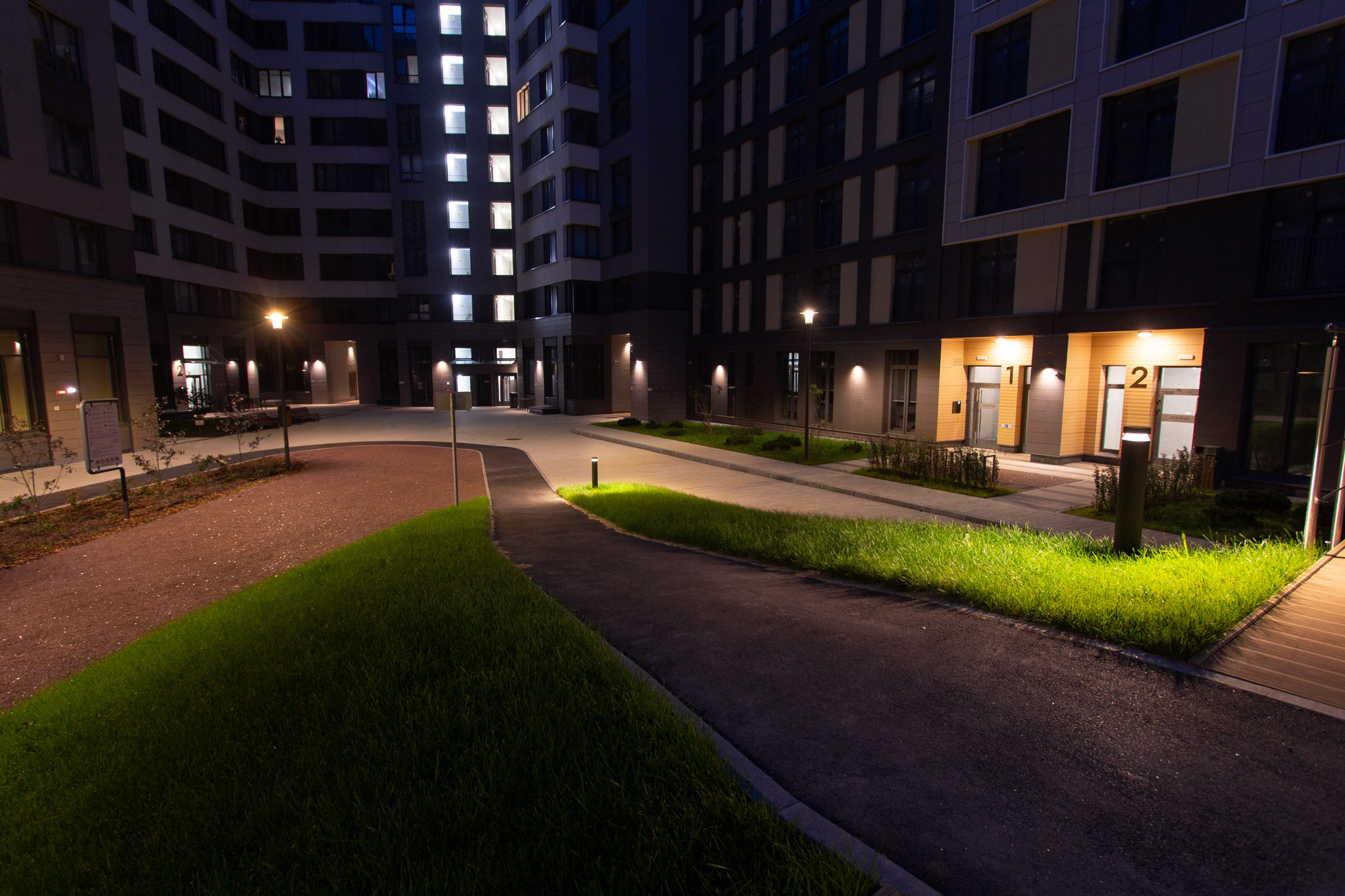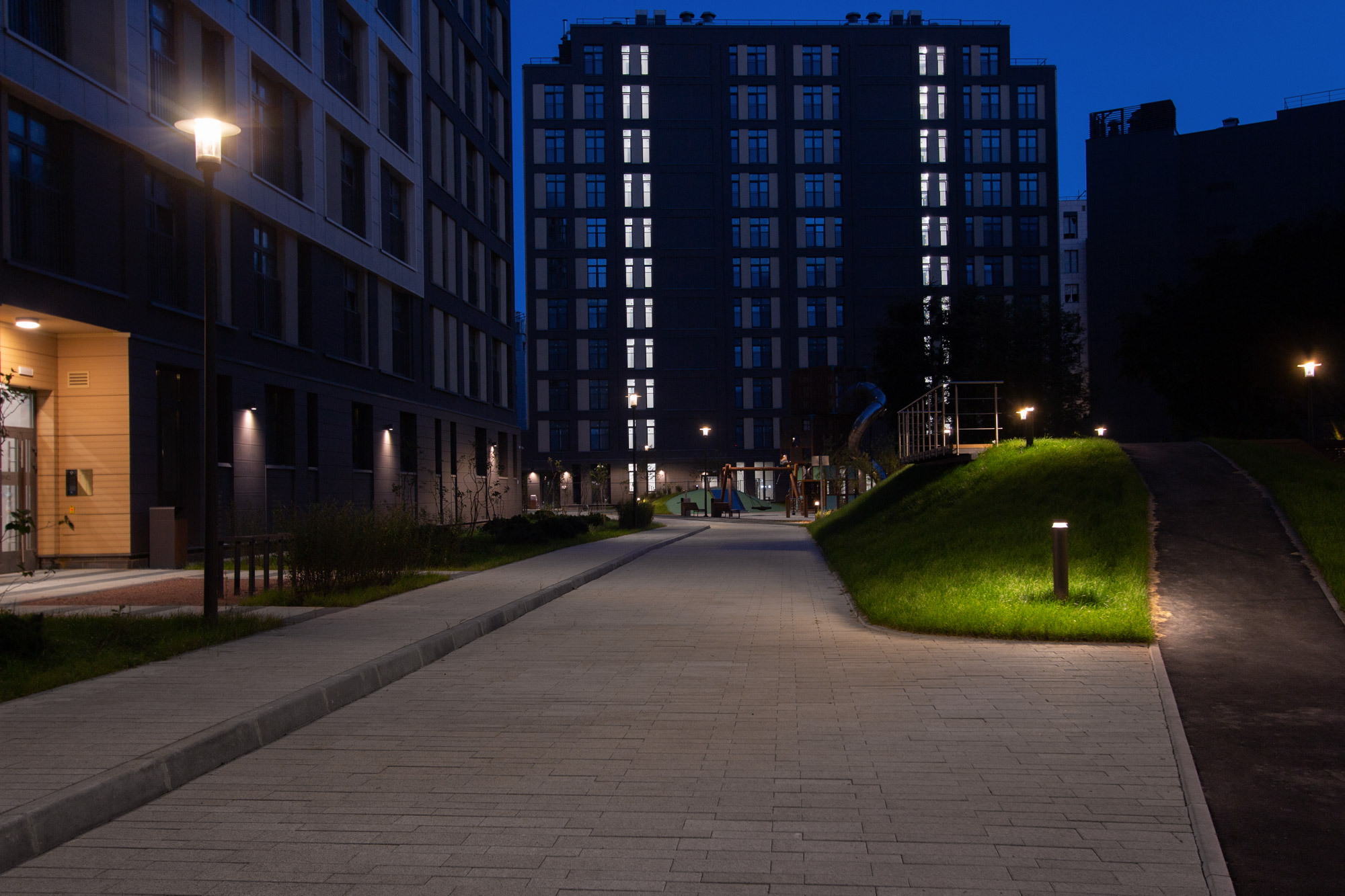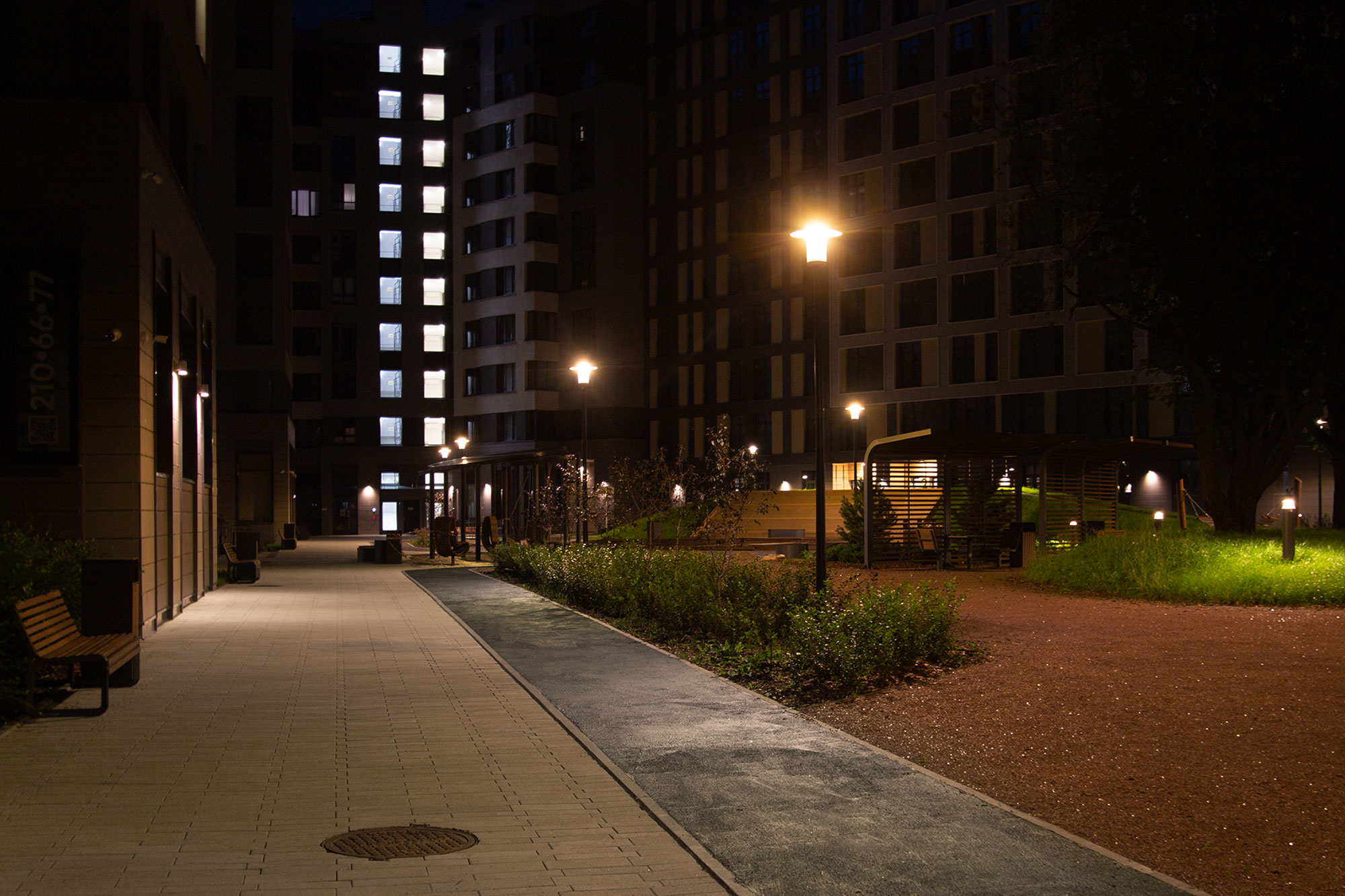 освещение придомовой территории ЖК парковыми светильниками с современным дизайном.