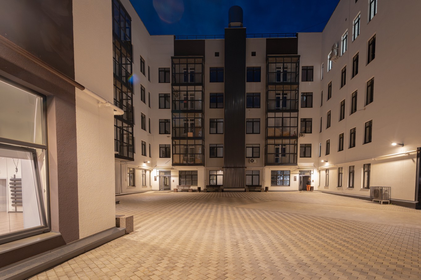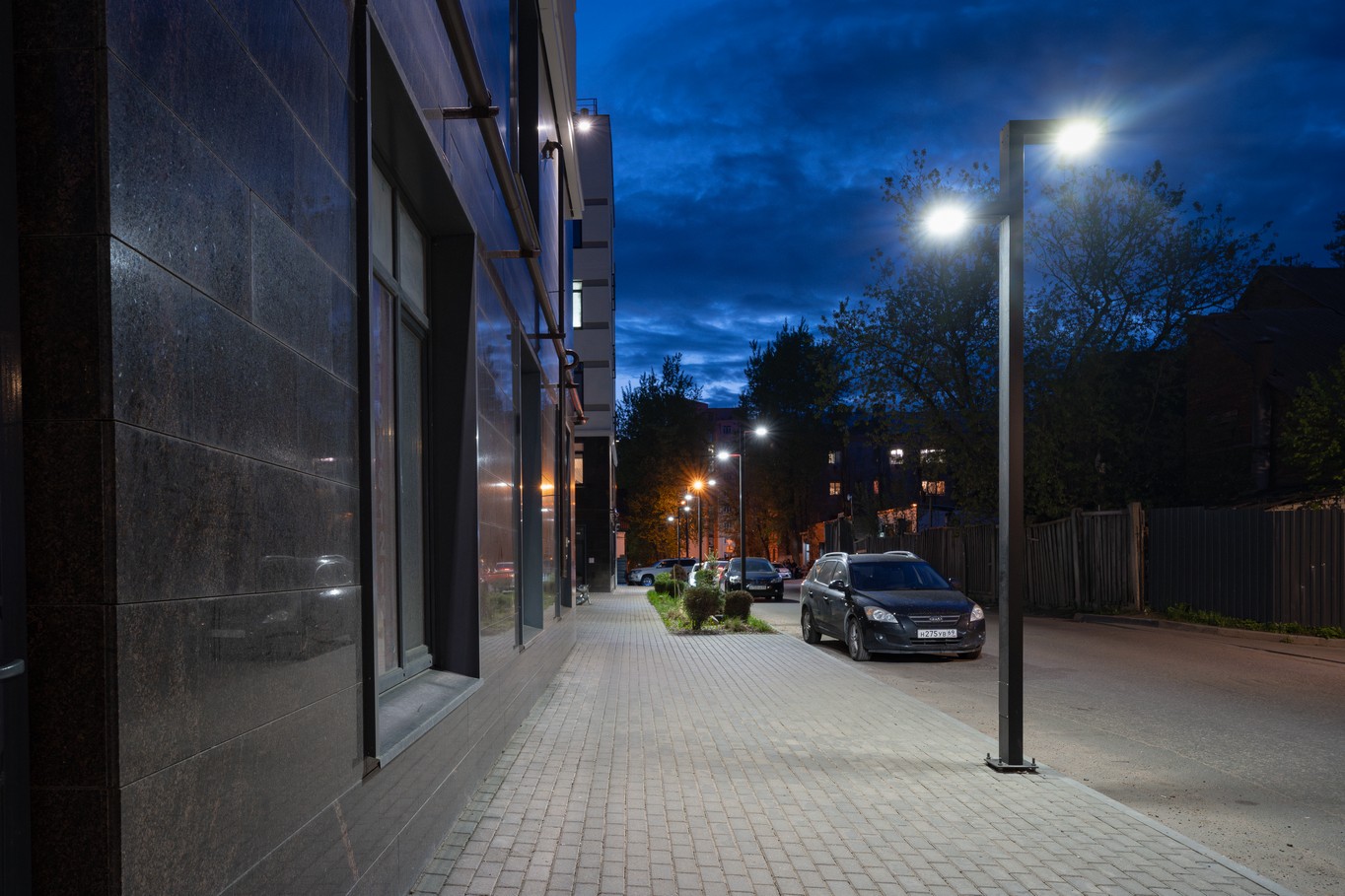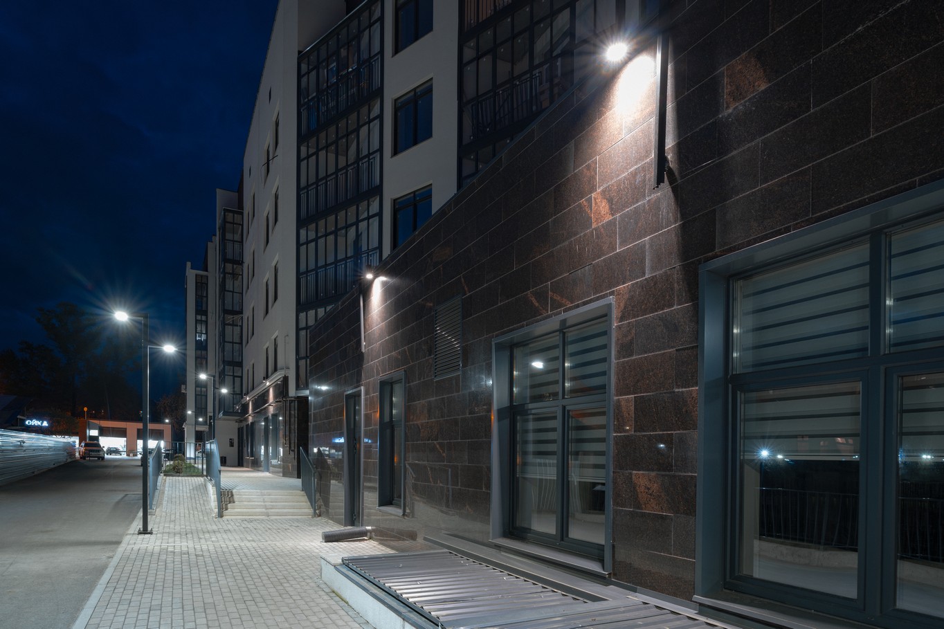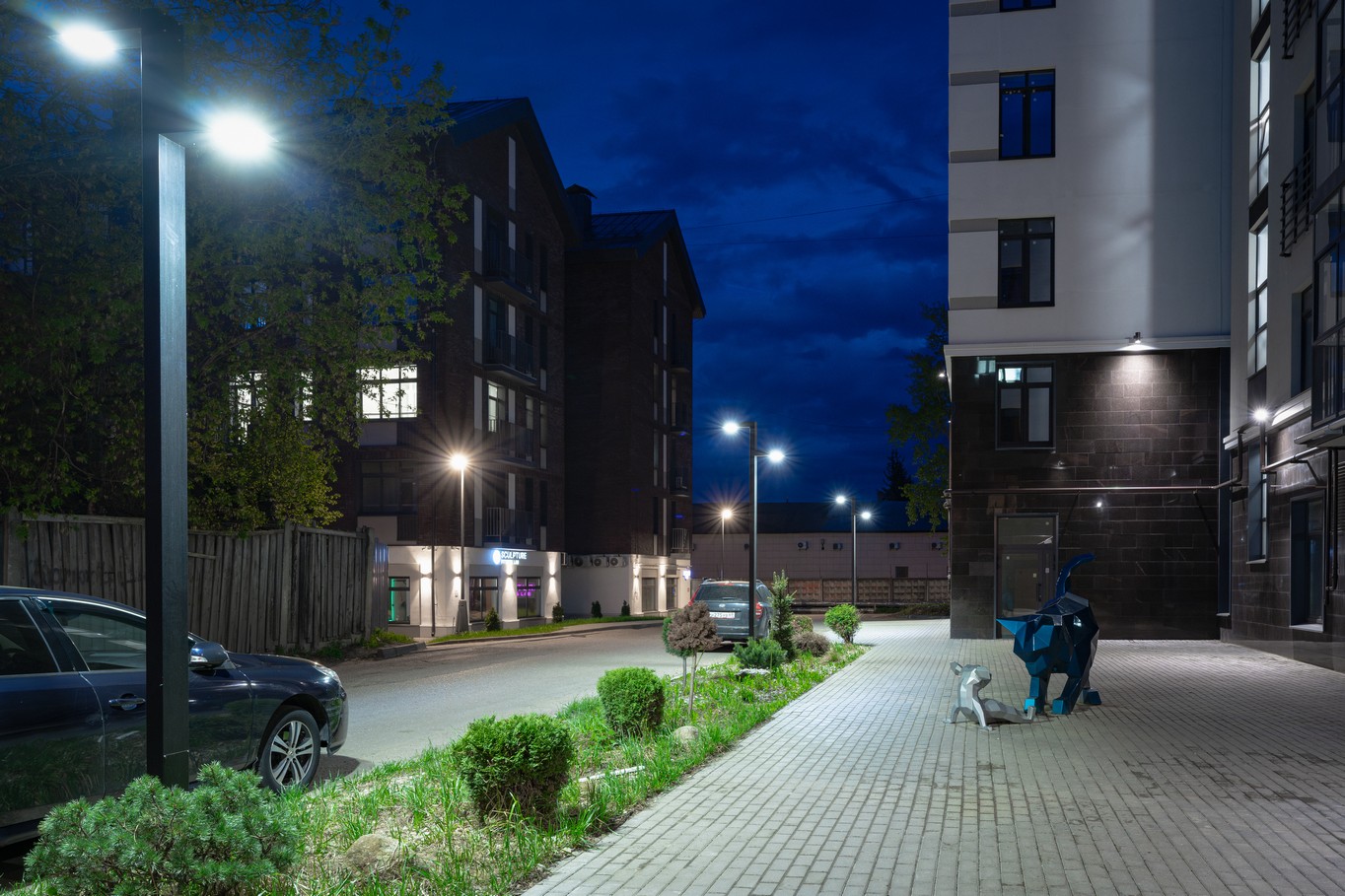 в рамках реализации проекта для освещения прилегающей территории были подобраны светильники серии «Парк». Для освещения дворовой территории ЖК были предложены светильники серии «Квартал» для установки на фасады здания.