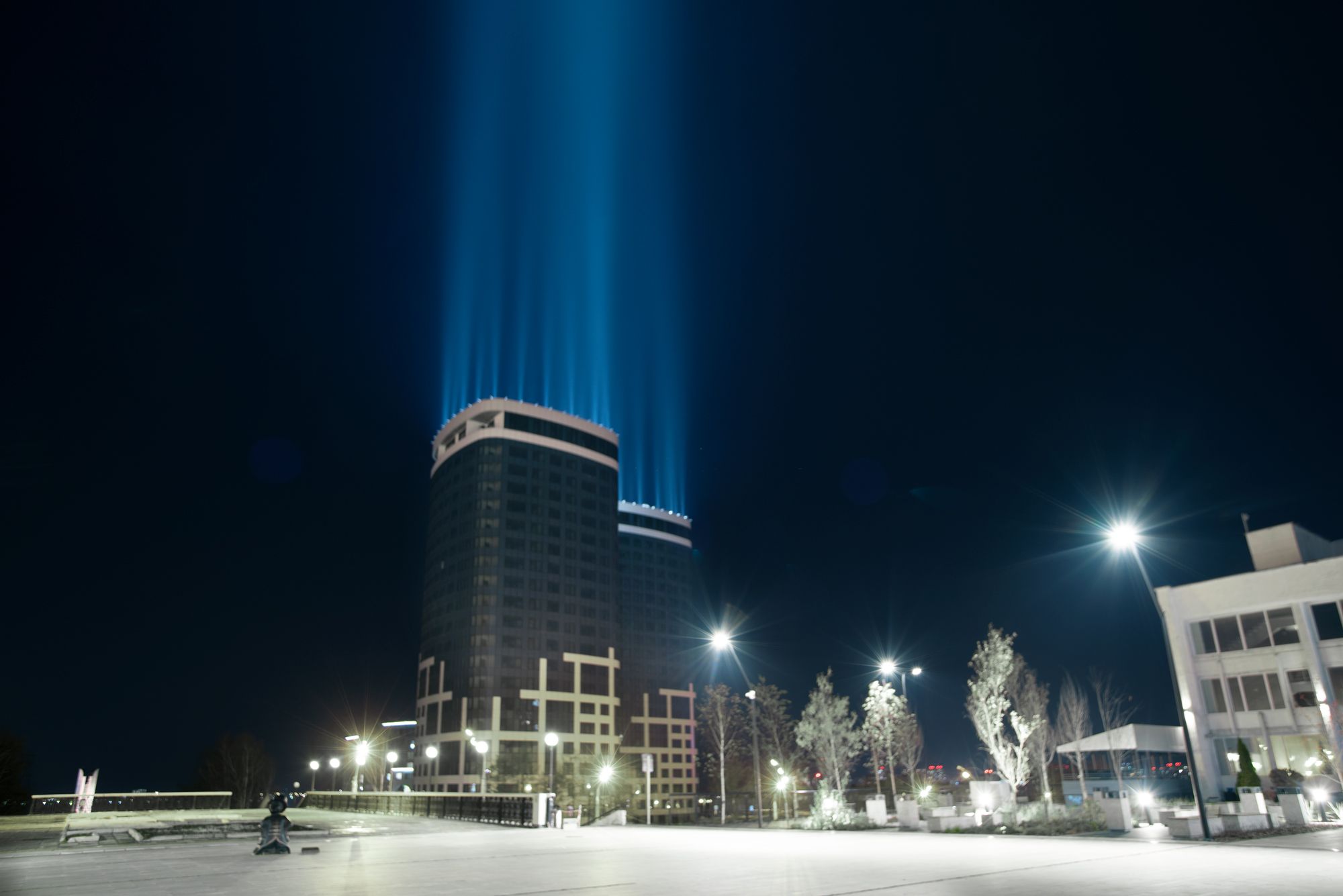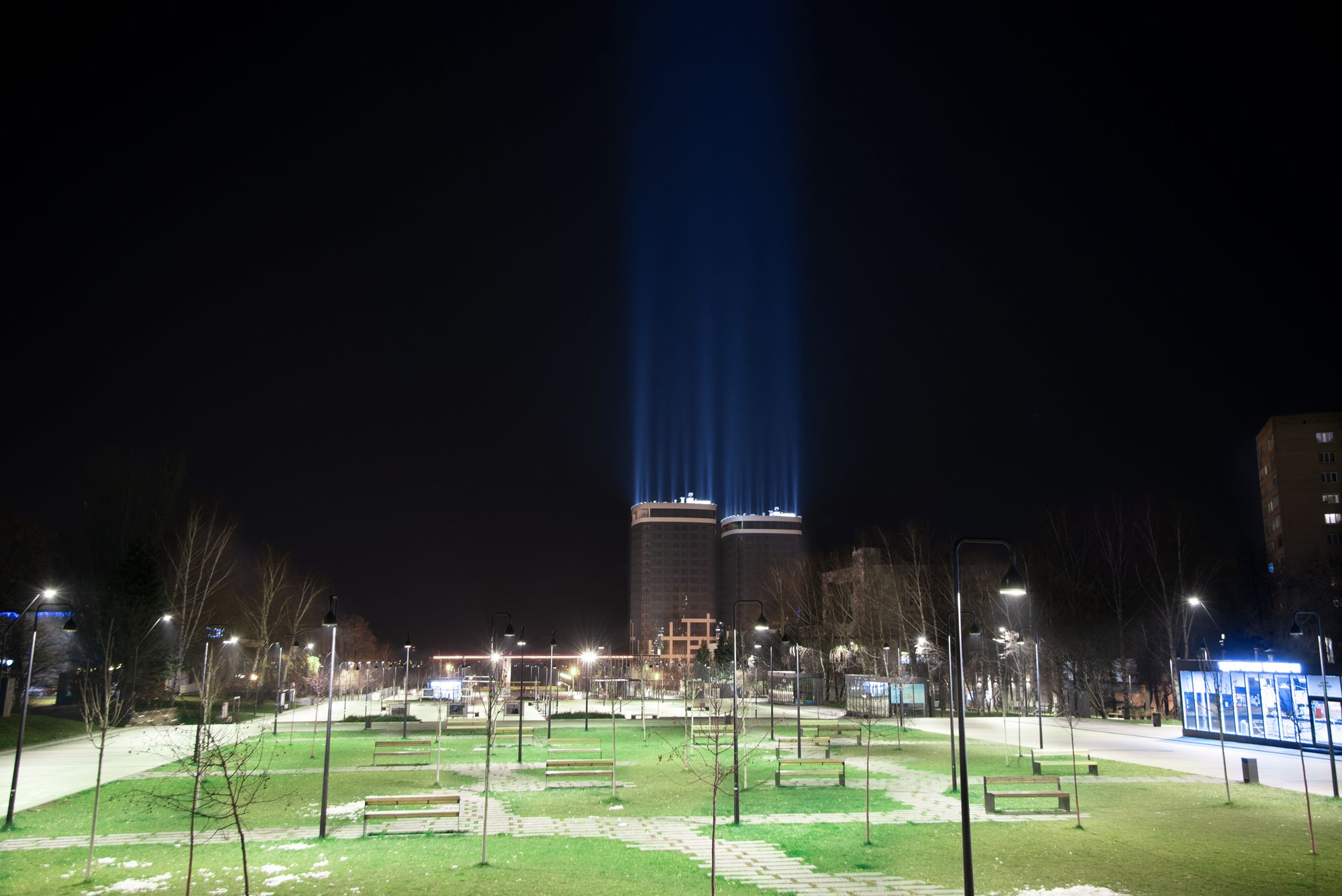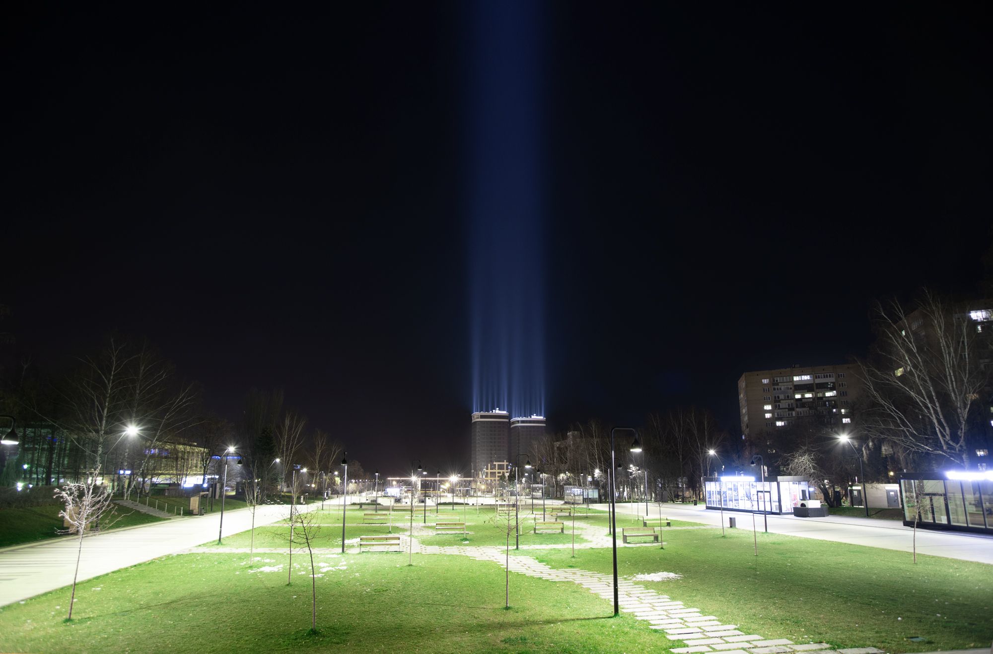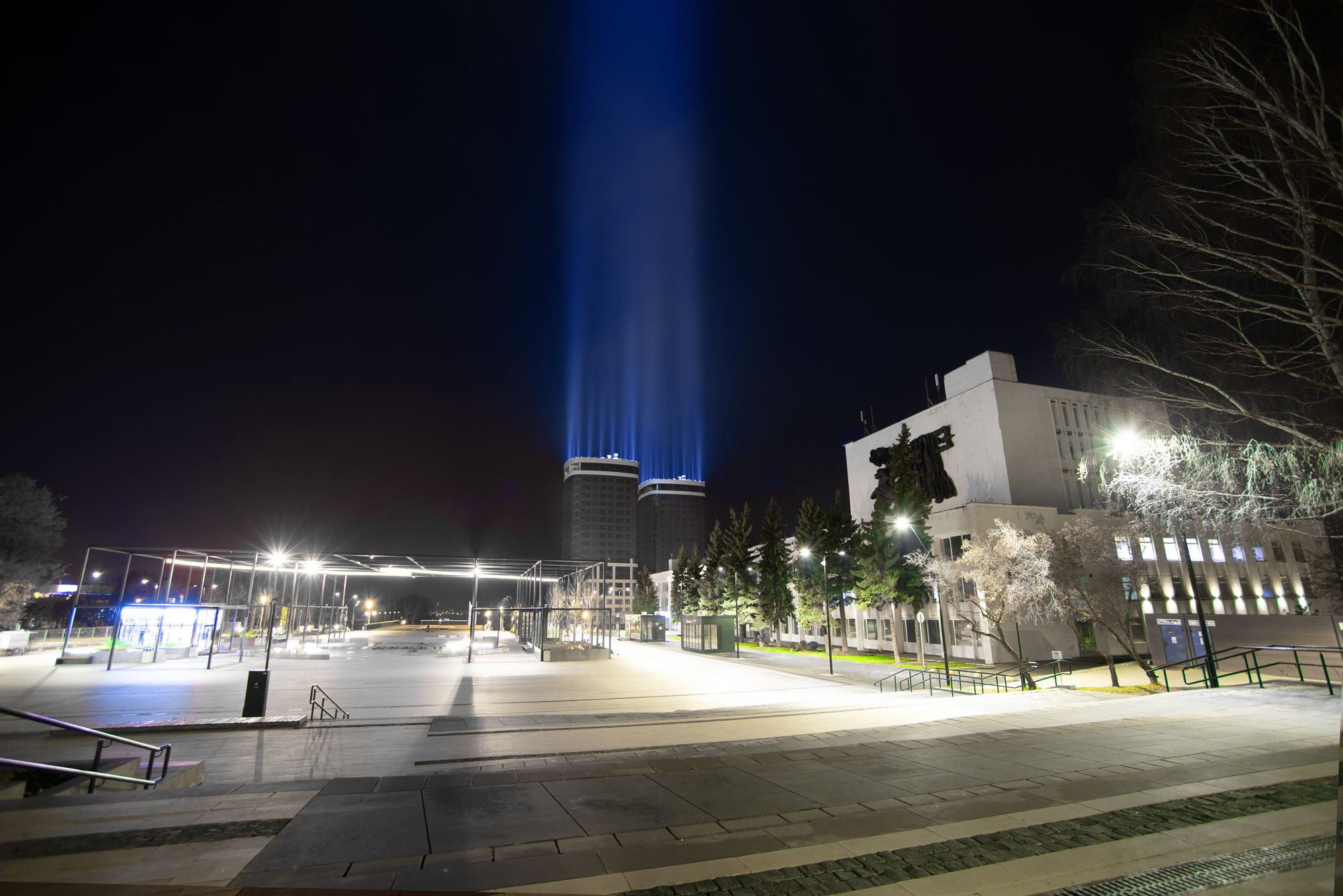 Поставленная задача: архитектурная подсветка зданий. Реализация «световых столбов» на крышах двух жилых домов.
